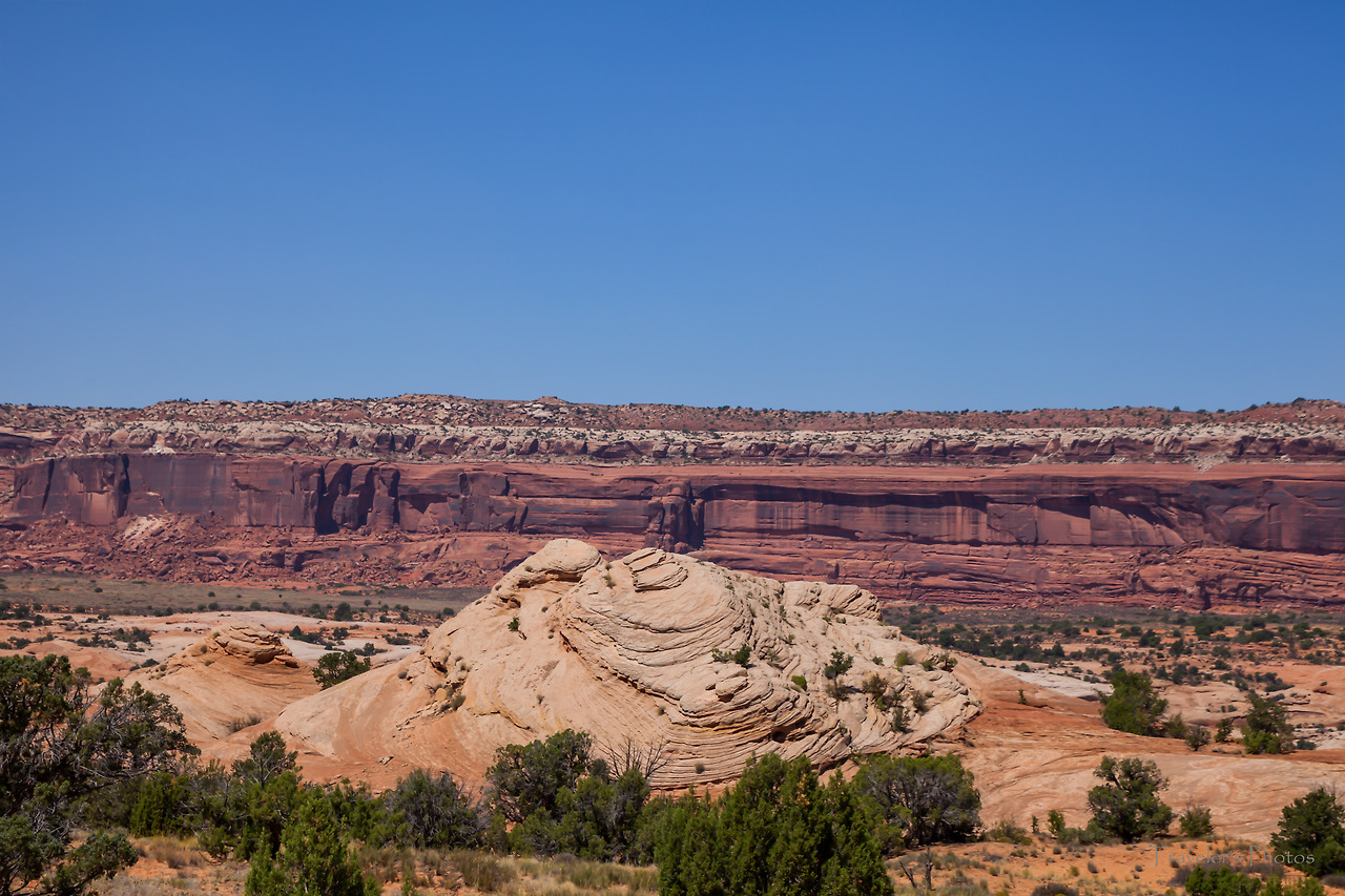 아일랜드 구역은 포장된 도로를 따라서 안으로 들어갔다 나오면서 구경할 수 있도록 되어있다. 도로를 따라가면서 군데군데 마련된 전망대에 들려 주변을 살피고, 근처에 마련된 산책길을 따라 걸으며 그곳에 있는 것들과 함께 호흡을 하다 보면 그들을 처음 마주했을 때 느꼈던 놀라움과 경외감이 어느덧 친근함으로 다가온다. 어느 전망대에 서있든 상관없이, 몇 번을 다녀간 것과도 상관없이 처음에는 낯설게 다가올 수밖에 없는 그들의 크고 넓은 풍경에 주눅 들다가도 '아, 그렇지, 그들과 내가 같은 하늘 아래, 같은 해 아래, 그리고 같은 구름 아래 서있지!'하는 데까지 생각이 미치면 이내 마음이 놓인다. 그러니 그 길에 몇 개의 전망대가 있는지, 그 전망대의 풍경이 어땠는지, 내려다보이는 풍경은 어땠는지, 그곳에 의자가 있었는지 기억에 없더라도 낙심할 것 없다. 이곳에는 강이 두 개나 흐른다. 어느 쪽에 있는 전망대를 가느냐에 따라서 그린 강이 만든 풍경을 볼 수도 있고, 콜로라도 강을 낀 풍경을 볼 수도 있다. 아일랜드는 아무래도 그린 강 쪽에 더 가까운지 그쪽 풍경이 더 잘 보이는 곳이 많지만, 두 강의 합수머리 부분을 볼 수 있는 전망대에 서면 가슴이 툭! 터지는 느낌을 받는다. 도로의 끝부분에 마련된 전망대의 이름이 그랜드 뷰 포인트 (Grand View Point)인데, 이곳에 서면 이름과 걸맞은 장면이 펼쳐진다. 여기 서서 눈앞에 펼쳐진 광대한 땅 위에 펼쳐지는 자연의 드라마를 보노라면 도대체 이곳에서 무슨 일이 있었길래 이런 풍경이 만들어졌는지 궁금해지기도 한다. 시간이 넉넉하다면 잠시 잠시 걸으며 주변을 둘러볼 수도 있다. 한 곳에 서서 둘러보는 것보다 더 다양한 각도에서 살펴볼 수 있을 것이다.