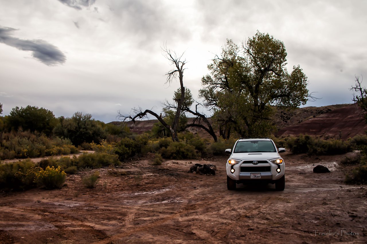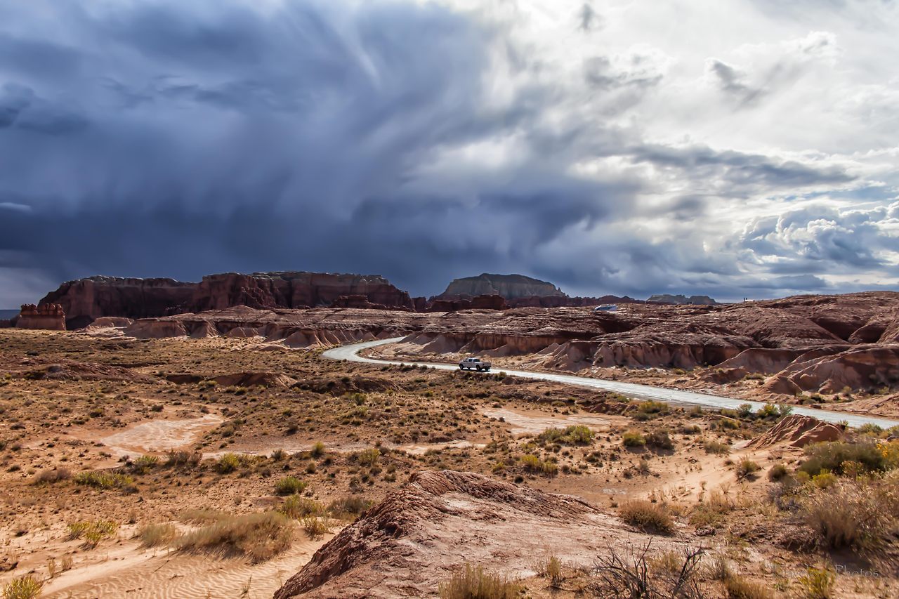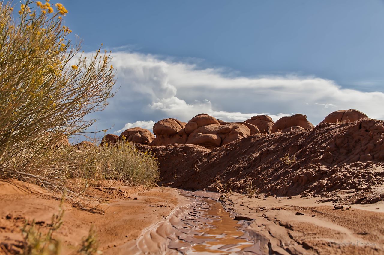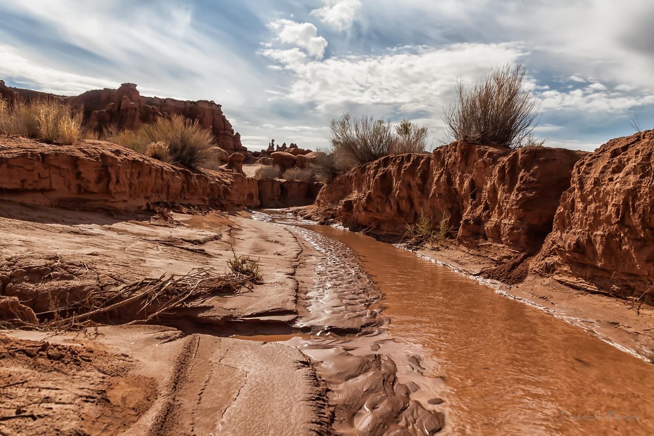 또 한 가지는 고블린 밸리를 방문하고 가려고 했던 오프로딩이 힘들어진다. 진흙밭이 된 길을 들어가는 일은 상당한 모험이 예상된다. 짧은 거리라면 사륜구동의 힘을 믿고 시도해 보겠지만, 수십 마일은 엄두를 내기가 어려운 거리다. 그런데도 언제나 그랬듯이 가던 길을 멈출 수는 없다. 빗줄기는 멈출 줄 모르더니 방문자 센터에 다다르니 언제 그랬냐는 듯 감쪽같이 사라져 버렸다. 대신 하늘엔 서서히 걷히는 구름과 그 사이로 틈틈이 보이는 파란 하늘이 진한 대비를 이룬다. 막상 공원 안에 들어서니 오면서 했던 염려가 기우였나 보나. 일부 질척거리는 부분이 없지는 않았지만, 오히려 비가 내린 흔적이 풍경을 더욱 흥미롭게 만들었다.