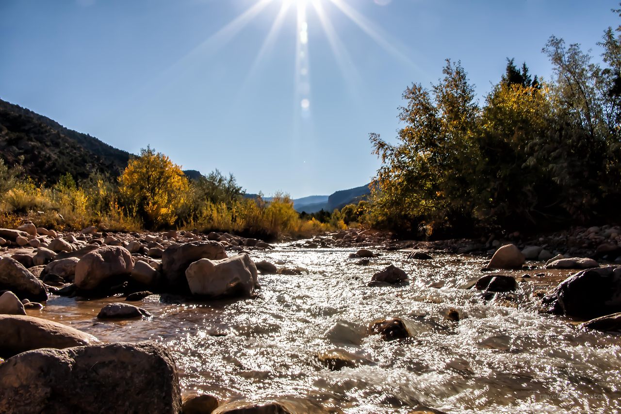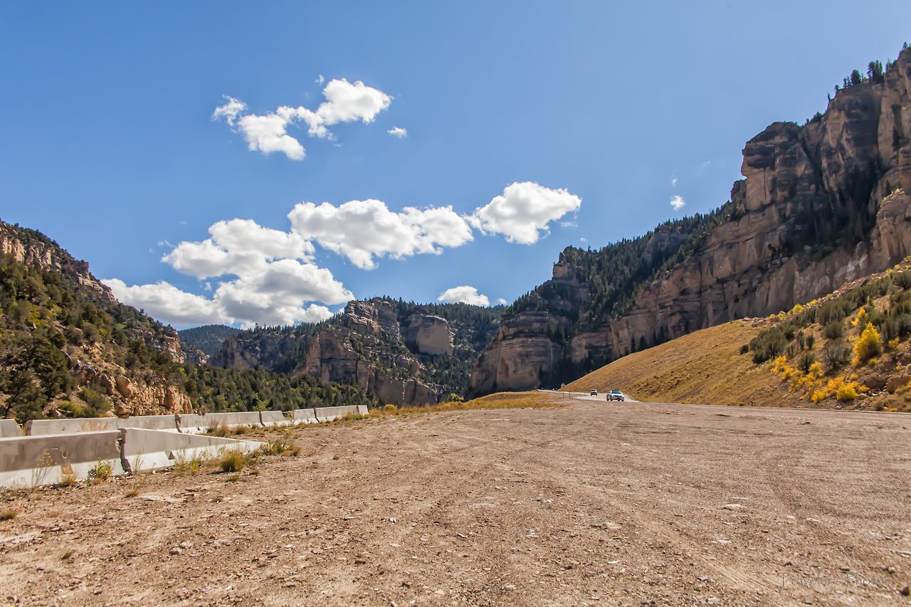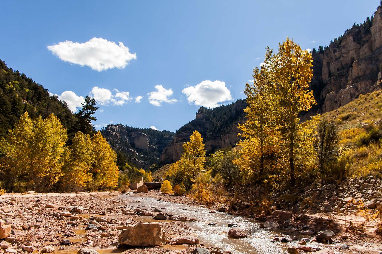 일단 서두르는 것으로 하기는 했지만 어쩐 일인지 썩 내키지는 않는다. 길섶 풍경이 눈에 밟혀 여전히 는적거리며 길을 가다, 마침 밥 먹기 좋은 장소가 나타나 간단하게 점심을 먹고, 주변을 둘러보니 여전히 눈길을 끄는 풍경이 쏟아져내린다. 길 아래 계곡을 따라 흐르는 물소리에 끌려 언덕을 가로질러 내려가 보았더니, 그곳은 길옆 높직하게 솟은 바위 풍경과는 영 다른 모습으로 반겨준다. 벌써 옷을 바꿔 입은 아스펜 나무들이 물길을 따라 줄지어있고, 그 사이를 신나게 흐르는 개울은 아직도 여름 인양 소리가 제법 우렁차다. 그렇게 딴전 피우는 사이에 또다시 재촉하는 소리가 들린다. 이제는 가야 할 모양이다. 잠자리를 마련하려면 너무 늦으면 안 될 테니.