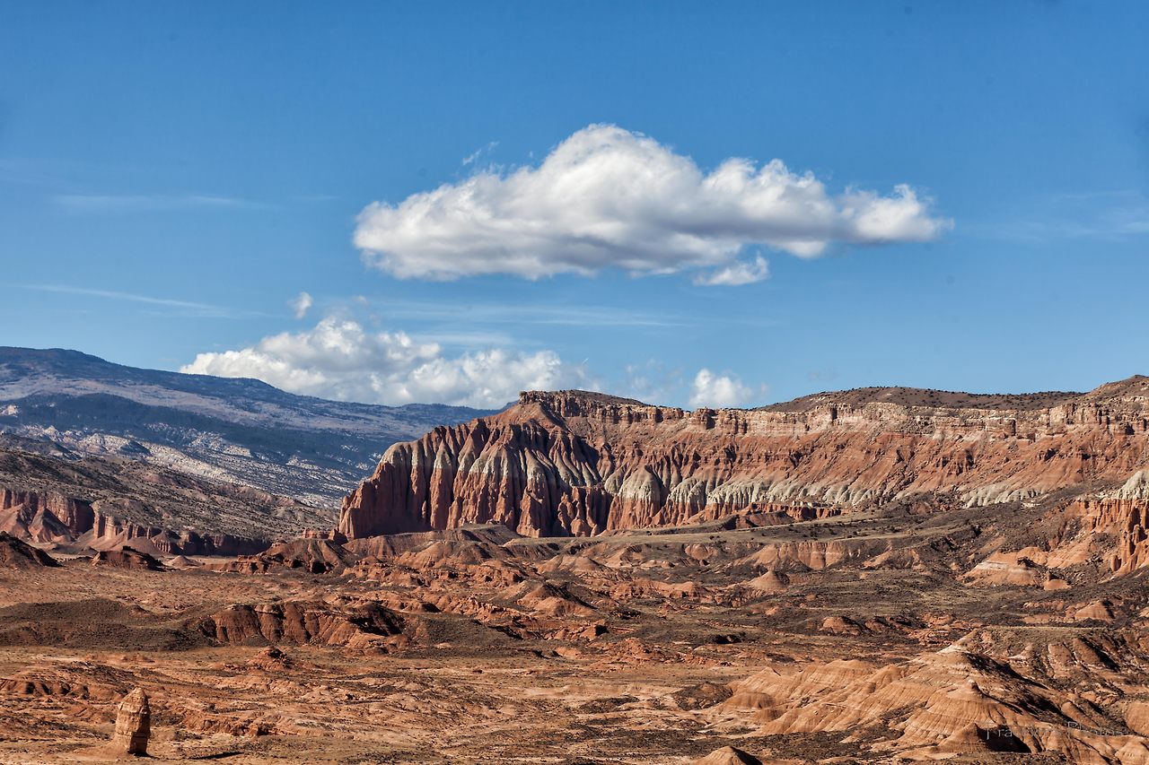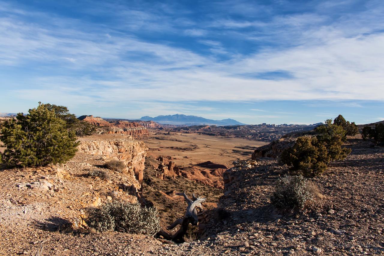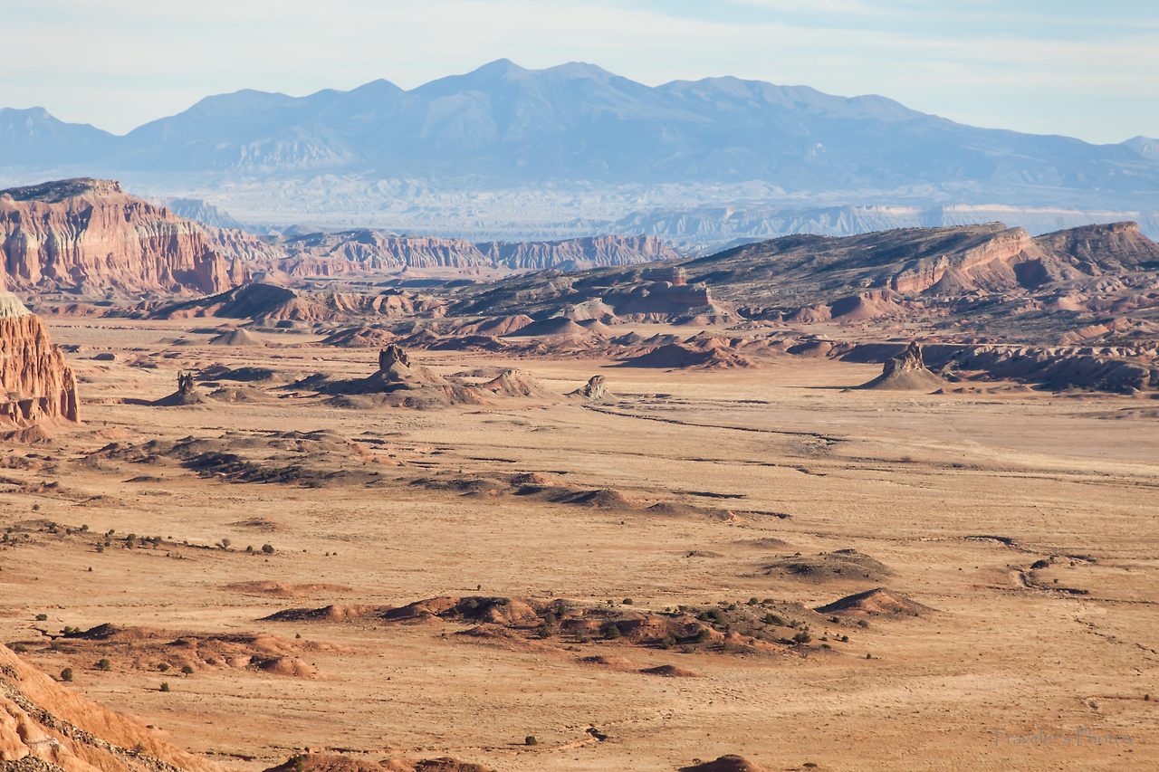 황량하고 지루한 길을 한 시간 여 달리다 보면 등장하는 전망대가 있다(Lower South Desert Overlook). 유타 남서부의 전형적인 모습을 보여주는 황토 지형이 널찍한 분지 위에 펼쳐져있다. 캐피톨 리프 국립공원의 다른 지역과 비슷하면서도 온통 황토 일색인 방문자 안내소 인근의 풍경과는 빛깔부터 좀 달라 보인다. 드넓은 평지를 달리다 느닷없이 펼쳐지는 이런 풍경과 마주할 때면 자연에는 우리가 모르는 또 다른 힘이 있지 않을까 하는 생각을 하게 된다.