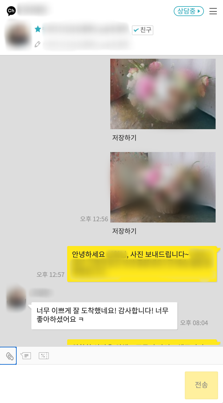이때 꽃 사진을 보내면서 보관 방법도 전달해보세요. 친절하게 알려주셔서 감사하다고 하실거에요. 빨리 시들었다며 클레임이 오지 않게 하려고 미리 방지 차원의 멘트를 하는 거죠.