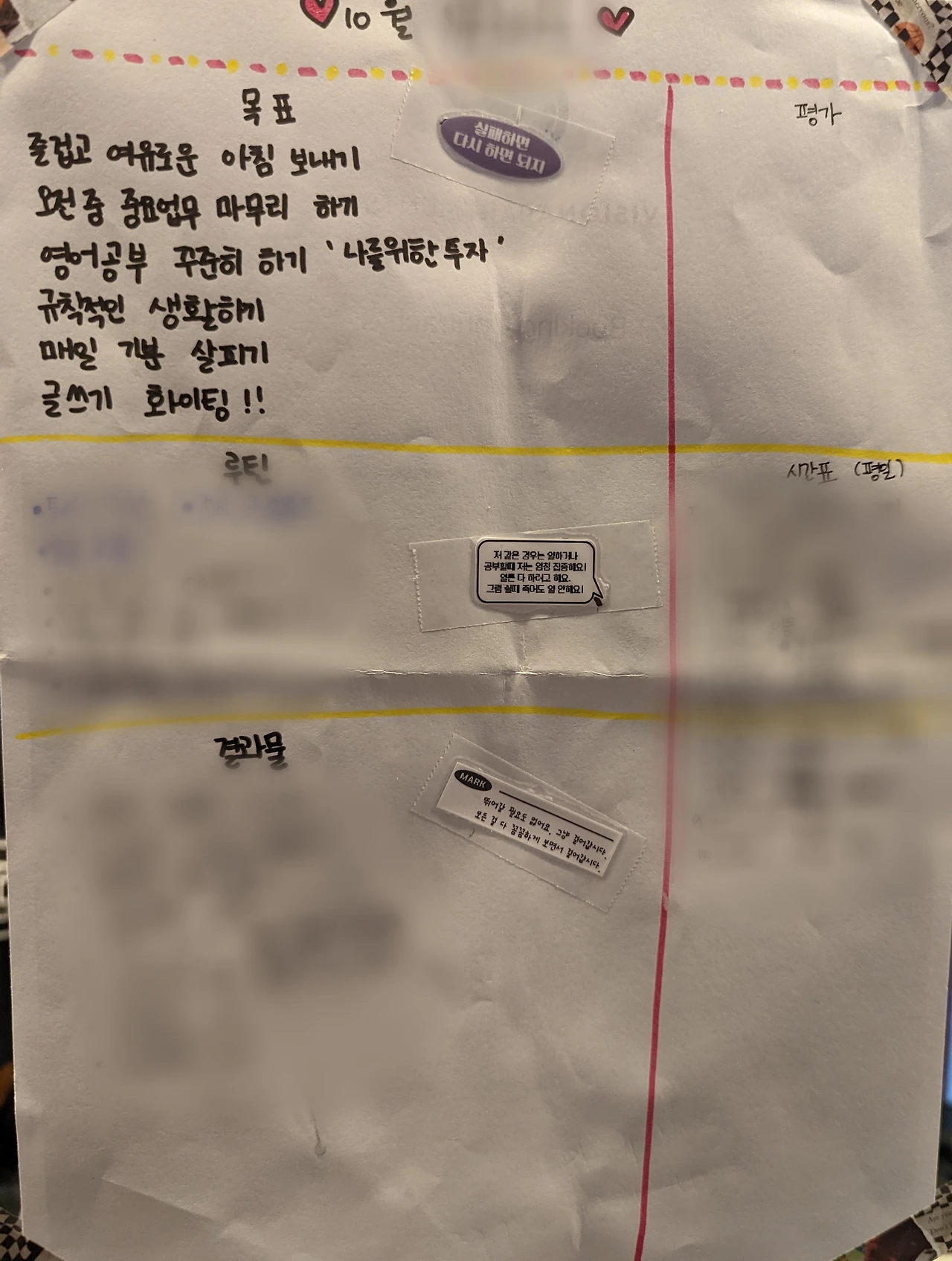 나는 새로운 한 달을 시작할 때 목표를 세워. 그리고 칭찬 스티커 판을 만들어서 꾸준히 해야 할 일들을 체크해. 이걸 일 년 가까이 해온 것 같은데, 이달에 처음으로 스티커를 한 장도 모으지 못했어. 월말이면 작물을 수확하는 농부처럼 뿌듯한 맘으로 스티커판을 떼어냈는데, 이달엔 볼 때마다 자괴감이 느껴져서 시월이 끝나기도 전에 스티커판을 서랍 안에 넣어뒀었어.