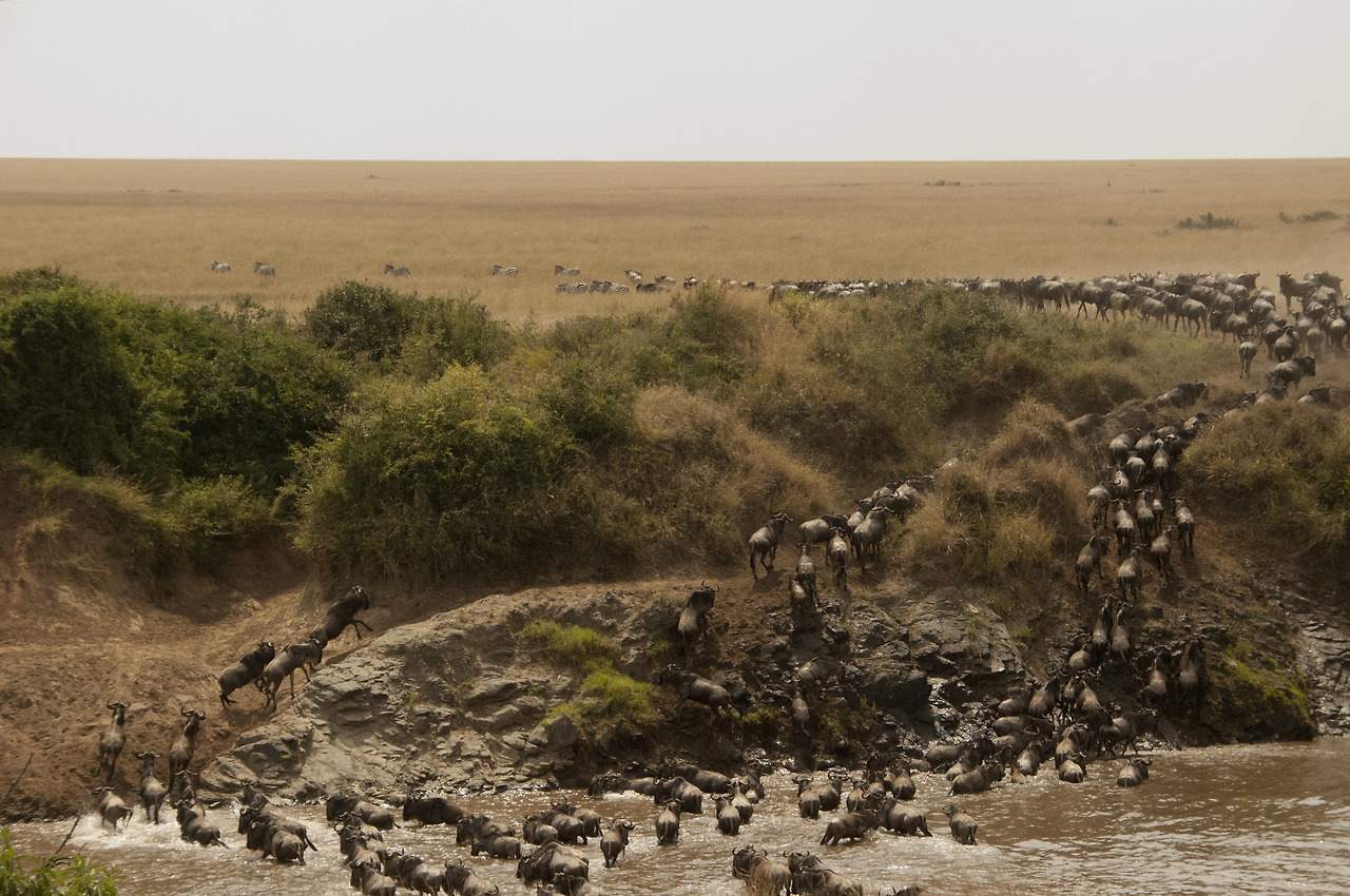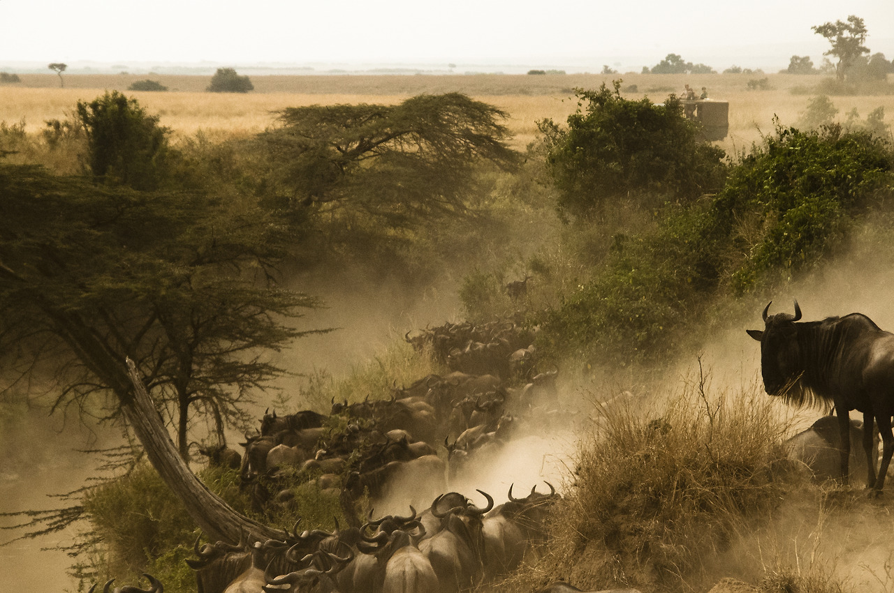 그 순간! 갑자기 차들이 동시에 출발하더니 강가로 돌진한다. 오오. 드디어 시작인가. 강 아래쪽으로부터 먼지가 뿌옇게 올라오는 게 아무래도 앞선 몇 마리가 강을 건너기 시작한 모양이다. 찰스는 다른 차들보다 더 좋은 자리를 선점했고 우리는 보았다. 그 고대하던 광경을.