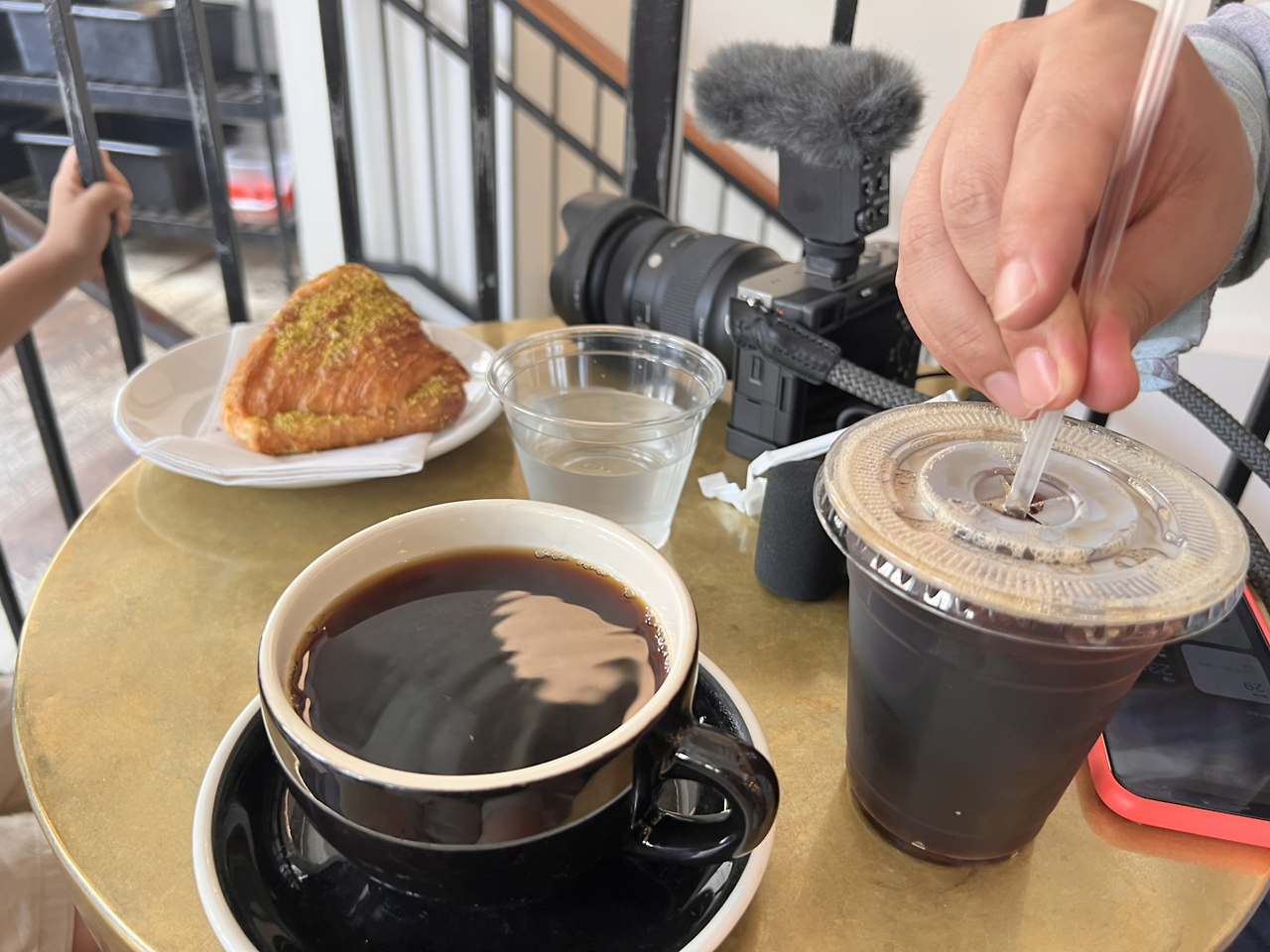 커피 한 모금과 유명한 피스타치오 크로와상 한 입.