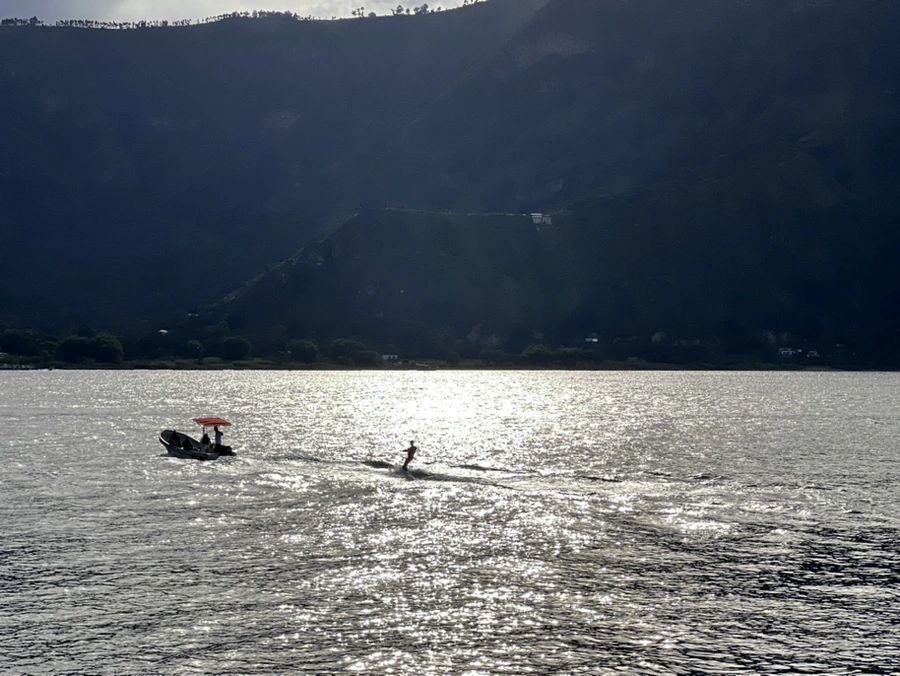 거대한 호수가 유유히 누워 있고, 그 뒤로는 우뚝 솟은 화산들이 병풍처럼 둘러서 있었다.