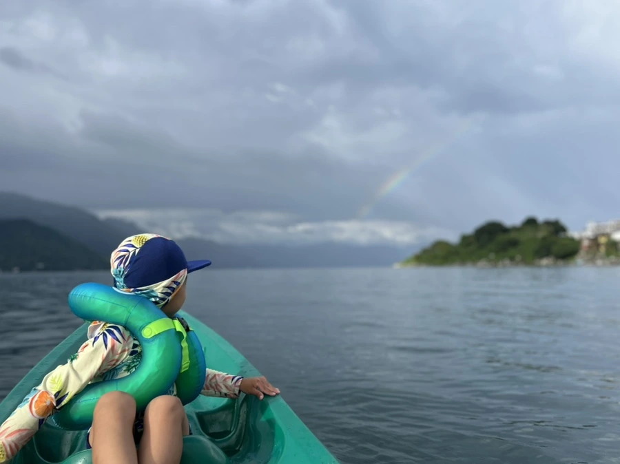 구명조끼를 입은 이든이를 카약 앞자리에 태우고 노를 저어 나아갔다.