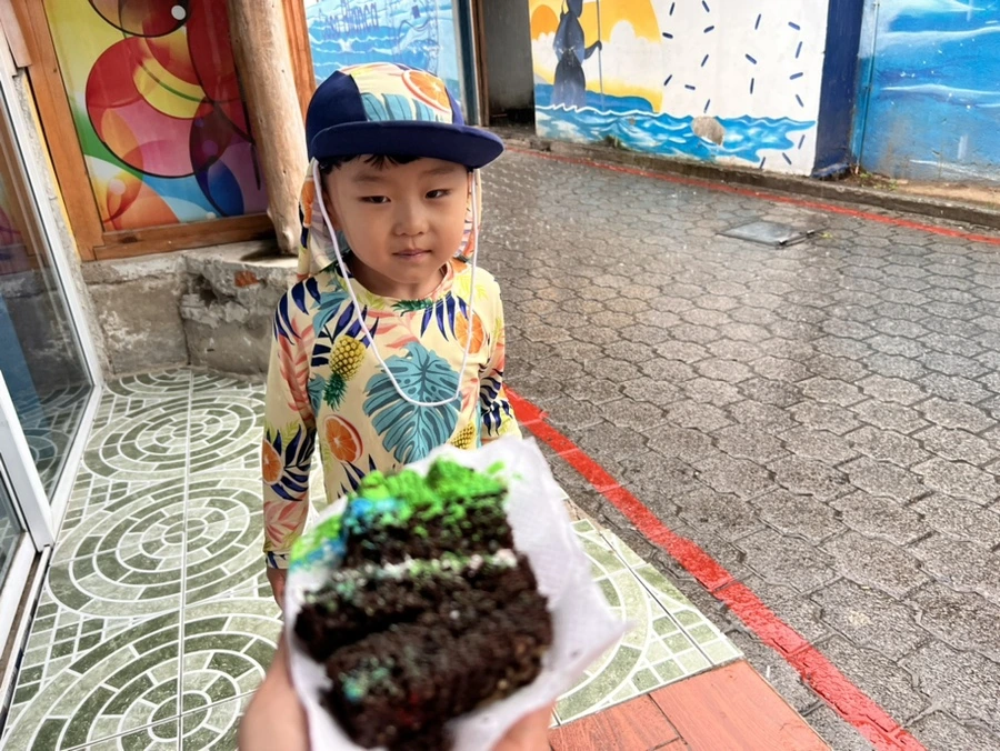 눈을 반짝이며 이든이가 그 문 앞에 서자, 안에서 한 아저씨가 다가와 케이크 한 조각을 휴지에 싸서 내밀었다.