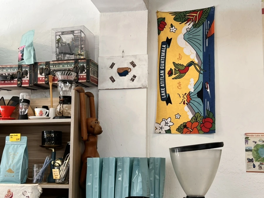 벽에는 커피 포스터와 원두 자루, 그리고 소소한 소품들이 장식처럼 붙어있었다.