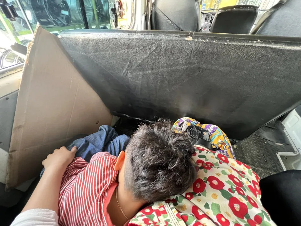 우리를 태운 차는 위로 들려져 바퀴를 고쳤다. 차 안에 잠든 이든이와 나는 왠지 원숭이가 된 기분이었다.
