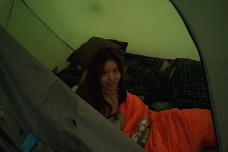 새벽, 갑자기 등에 땅의 한기가 맞닿는 느낌에 눈이 떠졌다. 당최 이게 무슨 일인지 침낭 아래의 에어 메트의 바람이 갑자기 빠지고 곧 정신이 번쩍 들 정도로 추워진다. 보일러와 침대가 한꺼번에 사라진 것이다. 다행히 우리가 대여한 텐트가 투룸이라 여분의 에어 메트가 있어서 한밤중 다시 텐트 속 이부자리를 정돈한다. 에어 메트를 깔고 젖은 침낭도 새 침낭으로 바꾼다. 놀라운 것은 이런 소란을 피워도 은영이는 깨지 않는다.