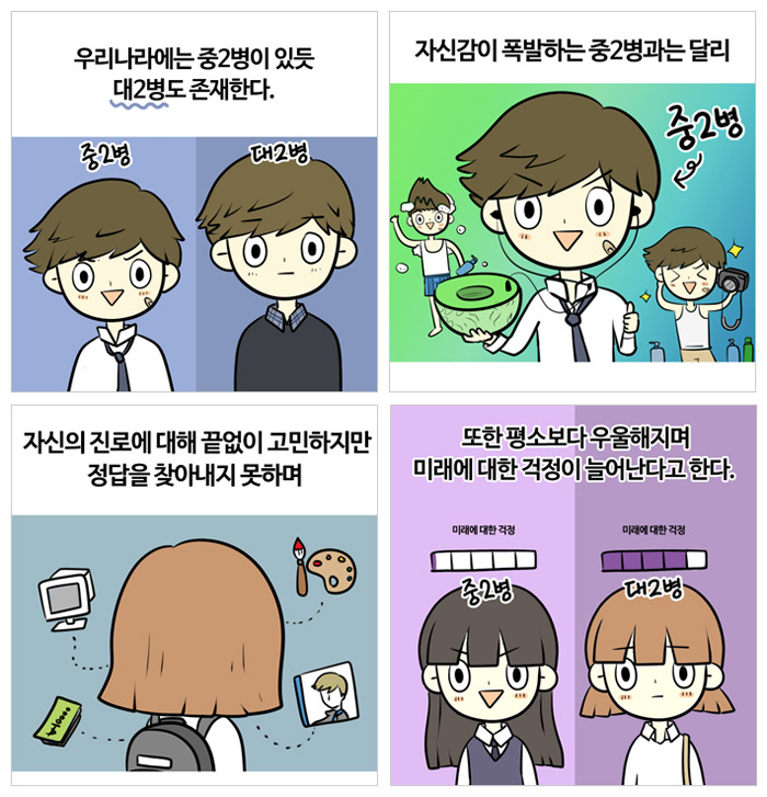 이와 더불어 요즘 대학생들에게 유행처럼 번지고 있는 병이 있습니다. 바로 ‘대2병’입니다. 대학 진학이라는 단기적인 목표를 최종 관문으로 여기며 지냈던 학생들이 막상 대학 진학을 한 이후에는 목표를 상실해 자신감을 잃고 자신의 진로에 대해 큰 방황을 하게 되는 모습을 보이는 데, 이를 ‘대2병’이라 일컫습니다. 대학 진학이라는 규정지어진 목표 때문에 실질적으로 자신이 좋아하는 것, 하고 싶은 것들에 대한 생각을 하지 못하고 인생의 최종적인 ‘목표’ 또는 ‘동기’없이 지내다 보니 성인이 된 대학교 2학년들이 그제야 진로에 대한 사춘기를 겪는 것이기도 합니다. 결국 ‘先진학, 後진로’라는 앞, 뒤 바뀐 아이러니한 방법론이 결국 이 같은 병리적인 현상을 만들고 있는 것입니다.