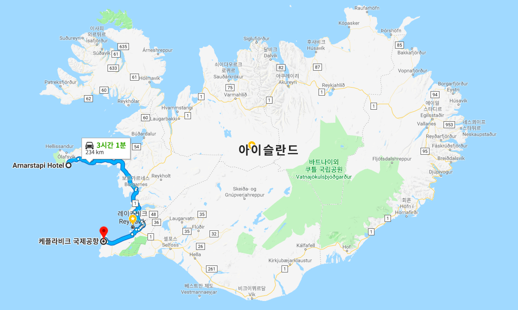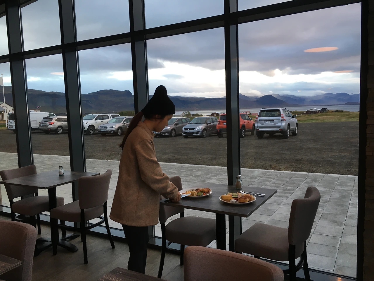 아이슬란드 여행의 마지막 날이 밝았다. 이 곳 아르나르스타피에서 케플라비크 공항까지는 3시간이 소요된다. 오후 4시 10분에 출발하는 비행기를 타야 하기 때문에 오늘 우리가 가용할 수 있는 시간은 이 아침을 어떻게 보내느냐에 달려있다. 마지막 날의 분주함과 아쉬움은 다행히 아내까지 아침 일찍 일어나게 했다. 조식을 먹기 위해 서둘러 호텔 레스토랑으로 향한다. 너무 부지런했는지 레스토랑에 아직 우리뿐이다. 덕분에 어제저녁 식사 때는 사람이 많아 아쉽게도 앉지 못했던 시원하게 밖이 보이는 창가 자리에 앉을 수 있었다. 몇 시간 전, 저 밖에서 오로라를 보았었다. 어젯밤 극광의 향연이 수놓았던 하늘에는 지금 얕은 구름이 가득하다.