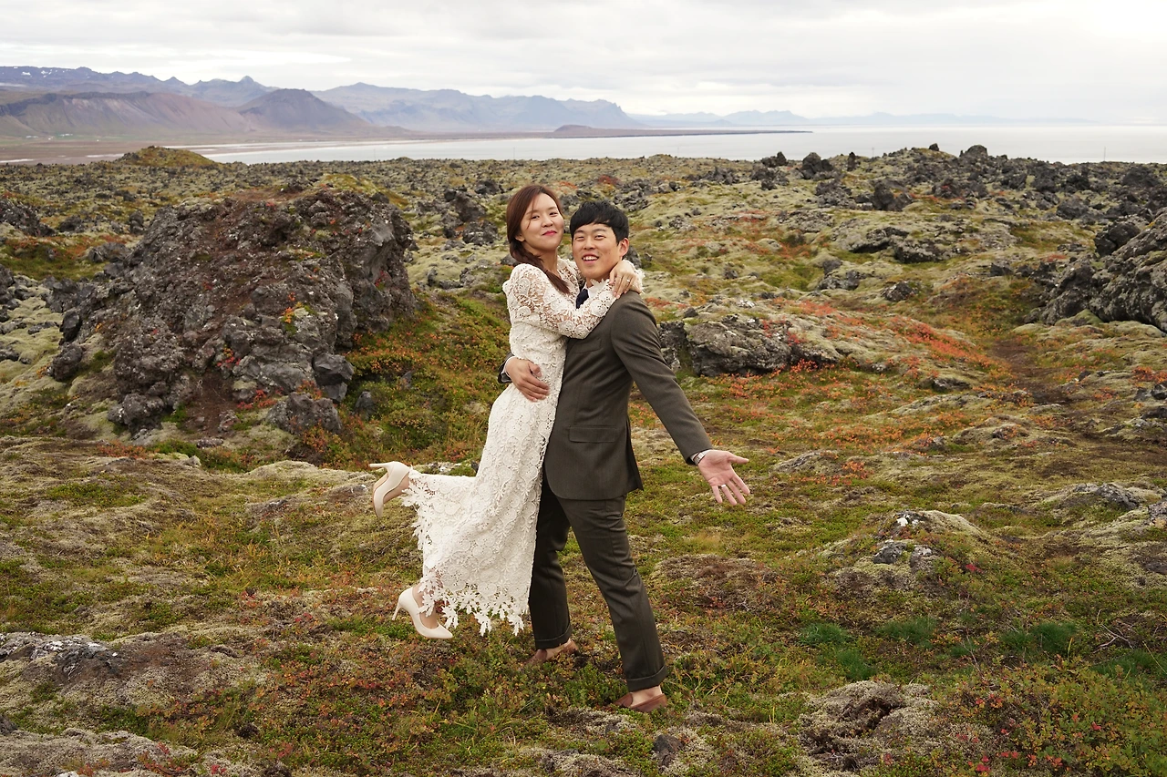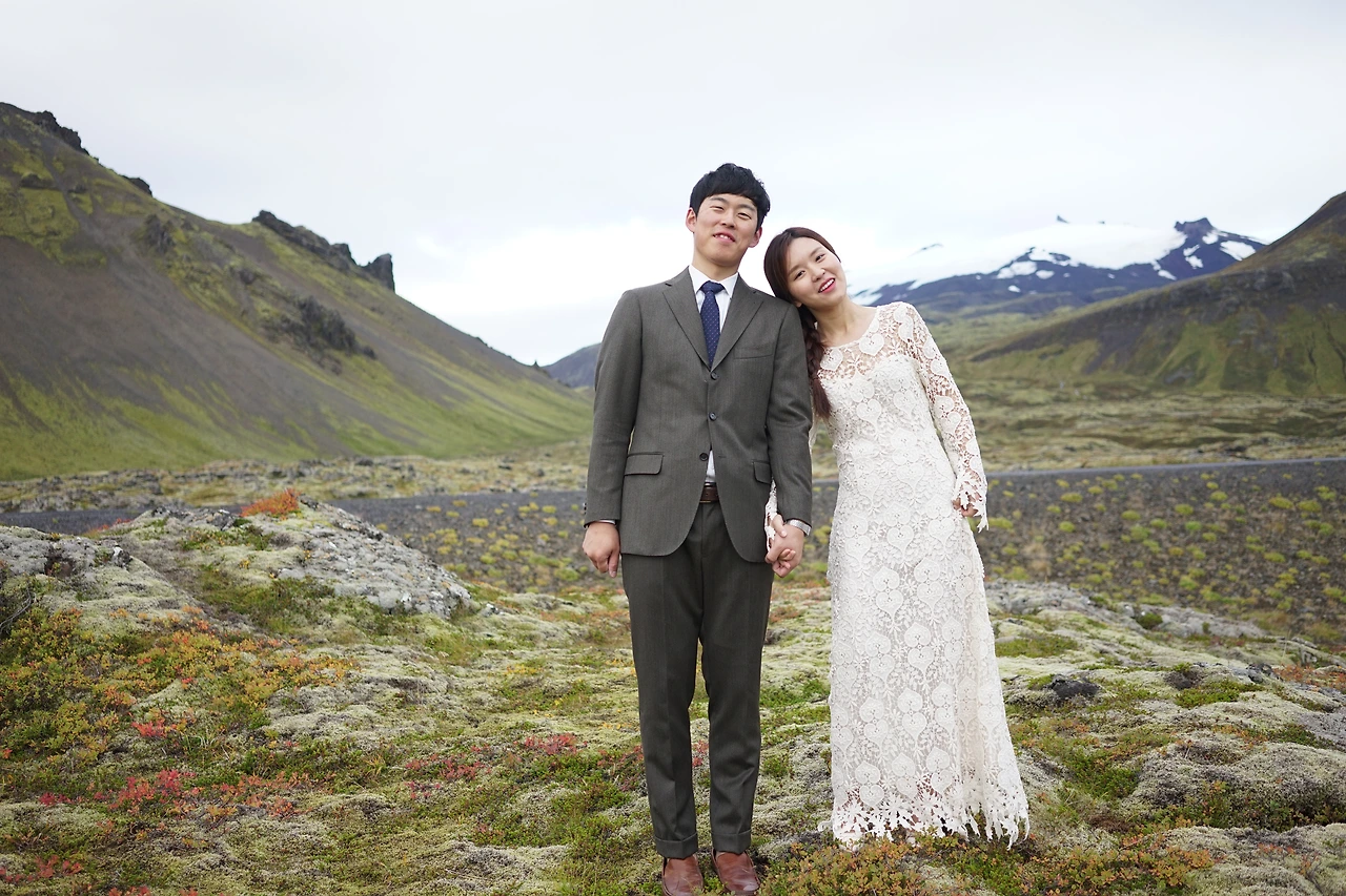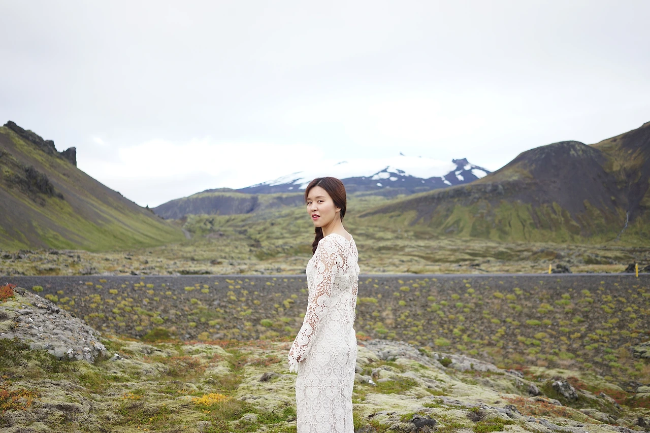 길 건너 산 끝이 둥근 산등성이 사이로는 저 멀리 눈으로 덮인 산도 보이고, 반대쪽으로는 이끼로 덮인 널따란 들판이 보인다. 낮은 채도의 대자연 속에 군데군데 생동감이 느껴지는 총천연의 작은 식물들이 수평선 끝까지 피어있다. 아이슬란드 특유의 쾌쾌함이 물씬 느껴진다. 더구나 사람들의 발길이 잘 닿지 않는 곳인 듯하다. 쑥스러움 많은 커플의 셀프 촬영에서는 이 점이 가장 중요했다.