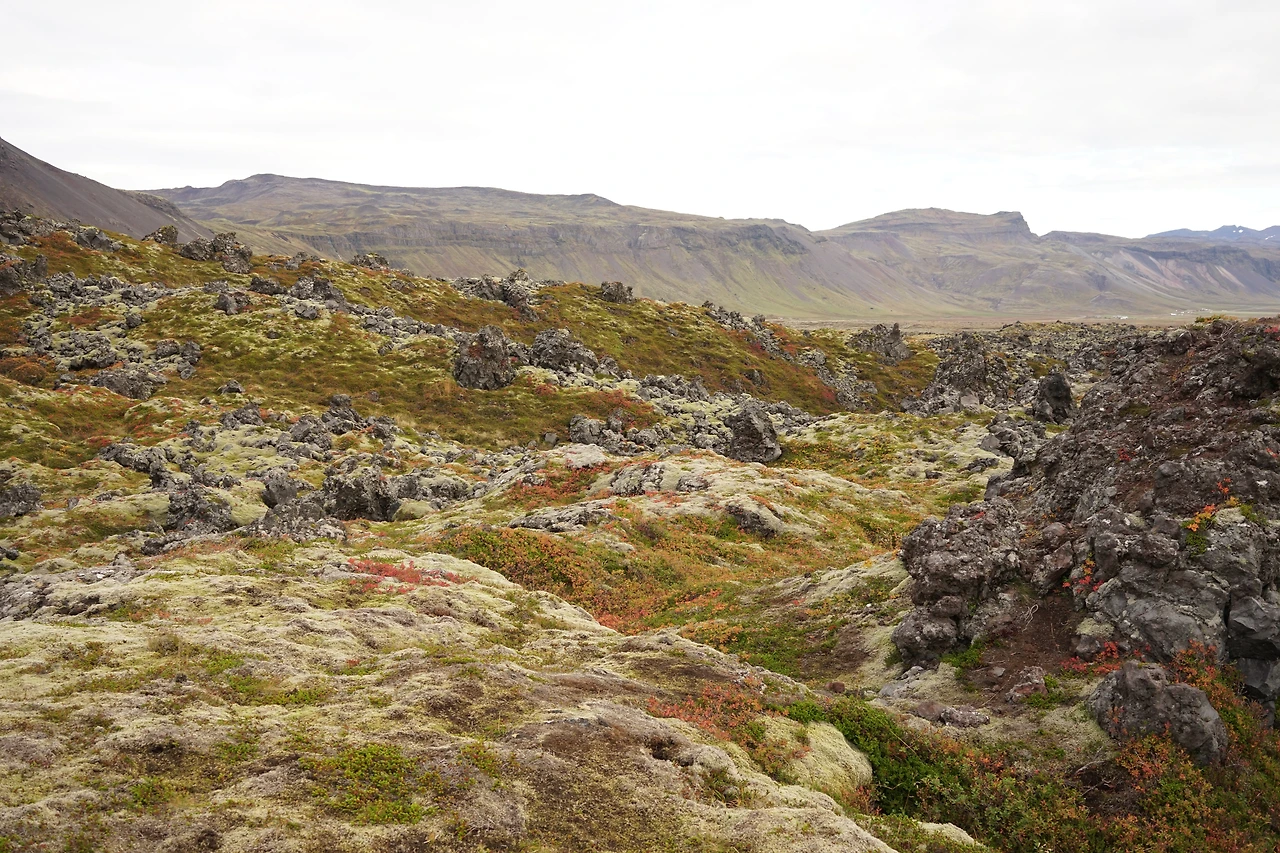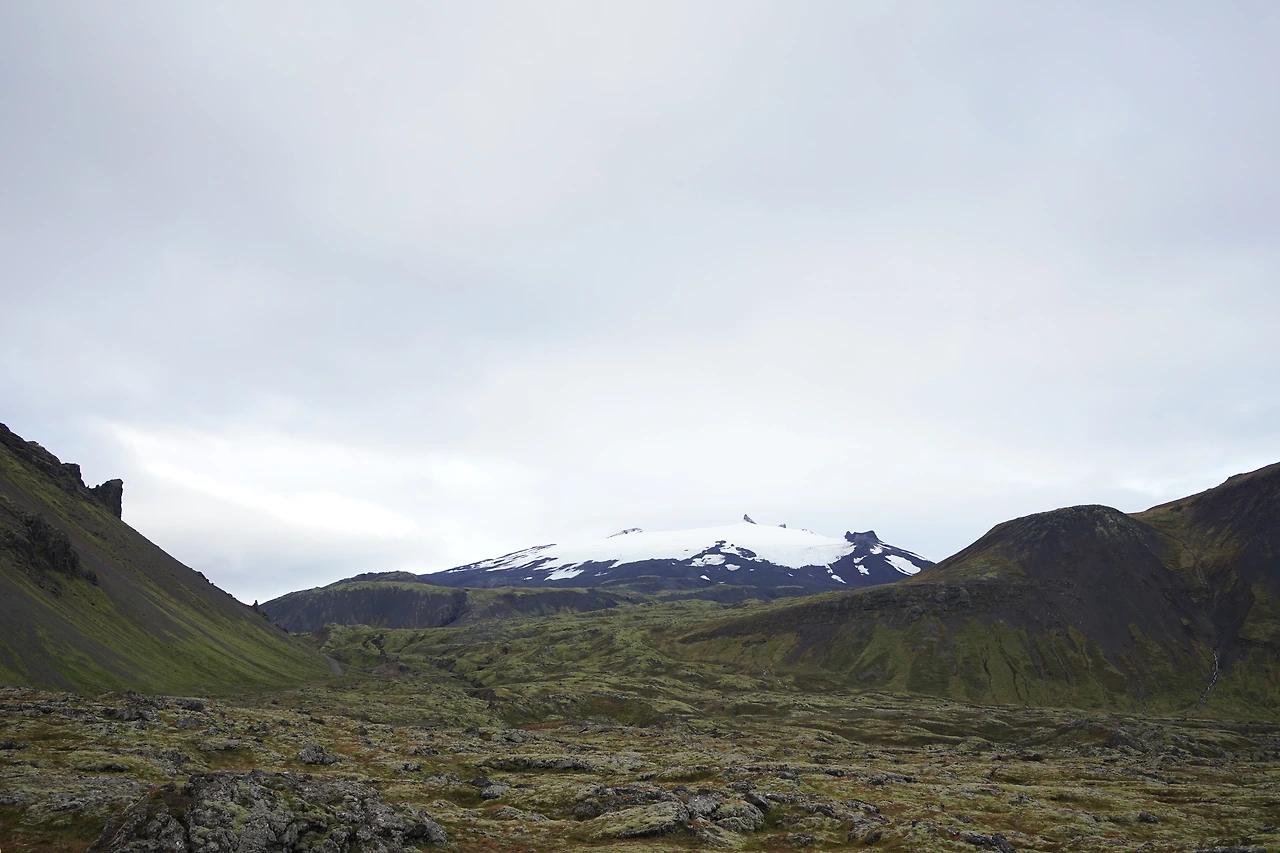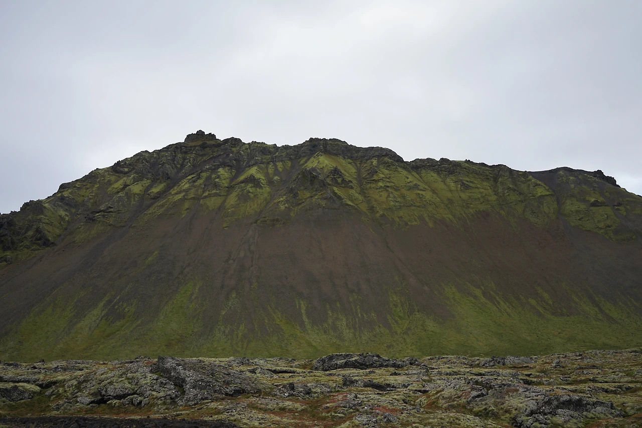 길 건너 산 끝이 둥근 산등성이 사이로는 저 멀리 눈으로 덮인 산도 보이고, 반대쪽으로는 이끼로 덮인 널따란 들판이 보인다. 낮은 채도의 대자연 속에 군데군데 생동감이 느껴지는 총천연의 작은 식물들이 수평선 끝까지 피어있다. 아이슬란드 특유의 쾌쾌함이 물씬 느껴진다. 더구나 사람들의 발길이 잘 닿지 않는 곳인 듯하다. 쑥스러움 많은 커플의 셀프 촬영에서는 이 점이 가장 중요했다.