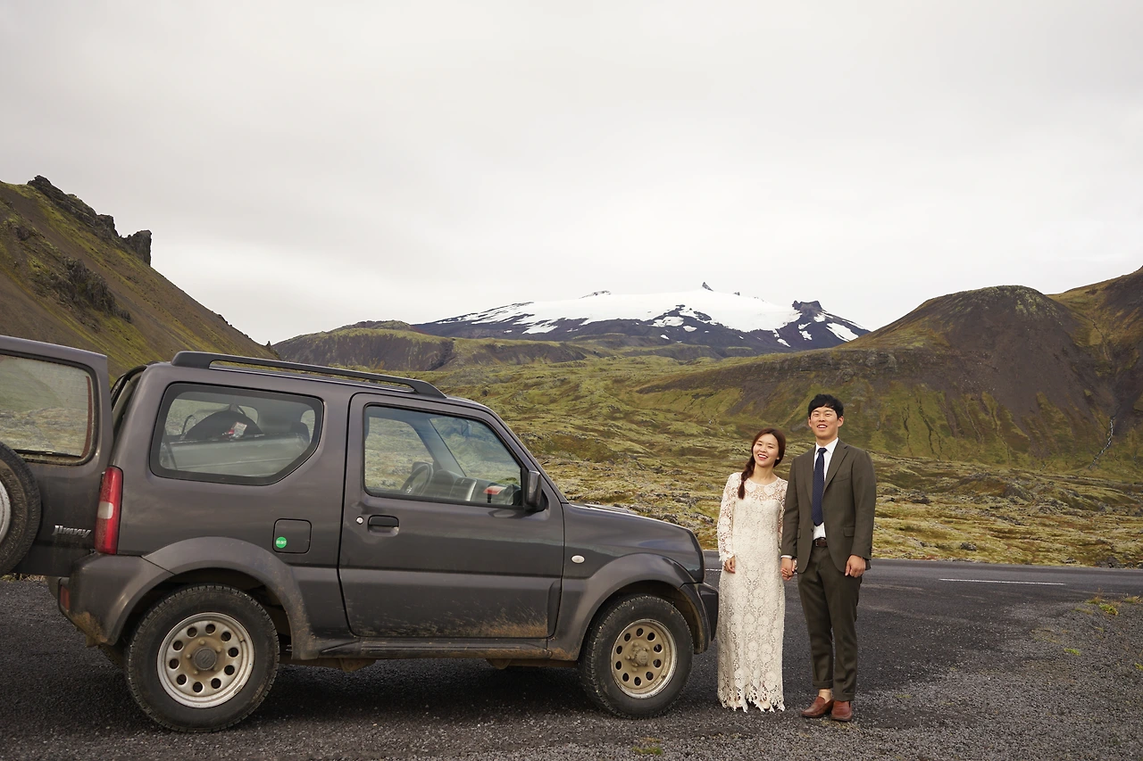 작품의 성공은 보는 이(또는 듣는 이)로 하여금 원작자의 의도를 느끼게 하는 것이 아닐까 생각한다. 그런 관점에서 오늘 촬영한 사진 한 컷을 고르라고 하면 나는 이 사진을 고르고 싶다. 오늘 촬영을 모두 마치고 도로 위에서 산을 배경으로 찍은 사진이다. 짐으로 가득 찬 자동차, 나의 돌아간 넥타이와 돌부리에 뒤꿈치 살갗이 까져서 접은 오른쪽 다리 바지 밑단, 고정시켰던 옷핀이 구부러져 매무새가 흐트러진 아내의 드레스. 이 한 컷에 우리의 드라마틱하고 다이내믹한 신혼여행 느낌이 잘 전달되는 것 같다. 그럼에도 불구하고(혹은 아무것도 모르고) 손 꼭 잡고 행복해하는 우리 표정으로 말이다. 이렇게 아이슬란드를 떠나는 날 우리 이야기의 표지 사진이 완성되었다.