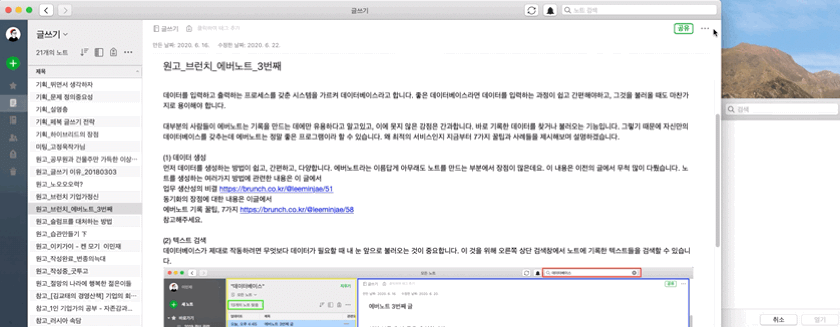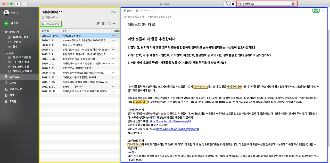 위의 그림처럼 오늘의 주제인 “데이터베이스"를 검색(빨간색)해보았습니다. 13개(초록색)가 검색되었습니다.왼쪽 노트 목록창(노란색) 에는 내가 검색한 검색어와의 관련도에 따라 정렬됩니다. 오른쪽 노트 창(파란색)에는 해당 단어가 색인됩니다. 접속하는 환경과 기기의 스펙, 저장한 노트 수에 따라 속도의 차이는 있겠지만, 그동안 제 개인적으로 찾고 싶은 단어를 포함하고 있는 노트를 찾는데 불편은 없었습니다.