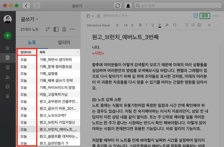 여러 사람들과 에버노트로 협업하는 경우에는 나도 모르는 사이에 노트들이 생성되기 때문에, 제목에 작성자를 기입하는 것도 노트를 파악하는데 중요한 정보가 됩니다. (물론 ‘노트 세부 정보'에서 누가 작성했는지, 수정했는지 등을 확인할 수 있습니다.)