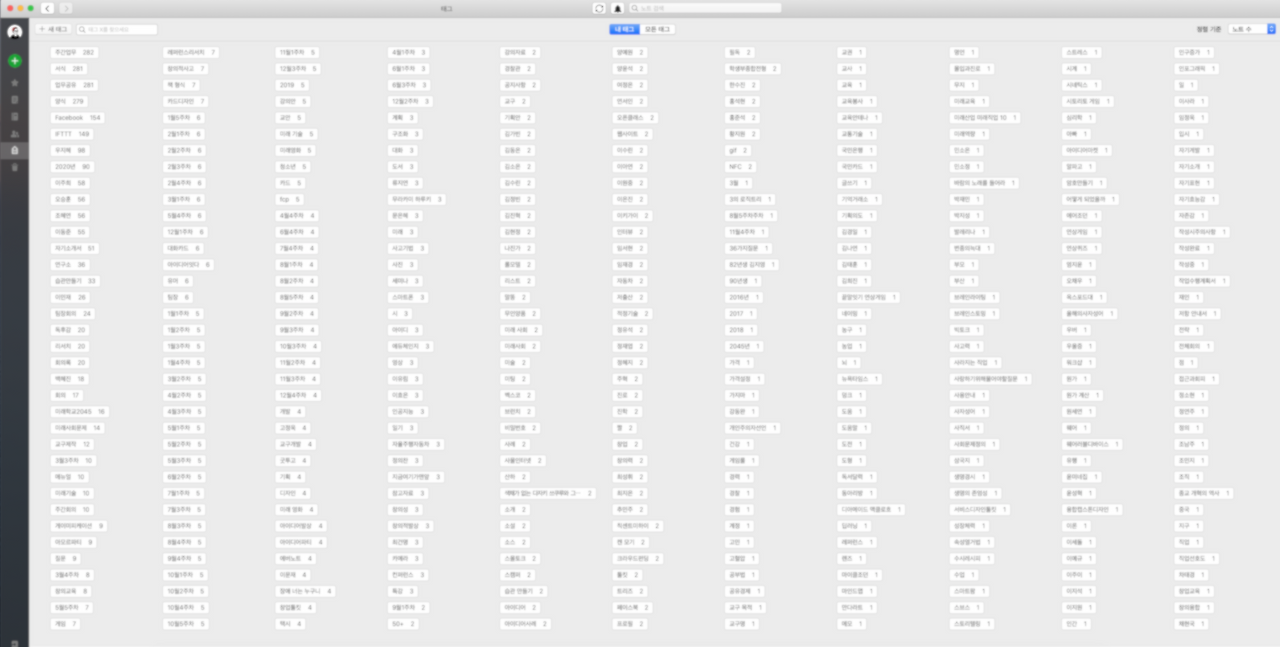 저장 시 노트에 태그를 붙일 수도 있습니다. 특정한 노트를 찾을 때에는 태그 검색을 사용하지 않지만, 그동안 저장한 노트를 참고하고 활용하고 싶을 때 요긴하게 사용합니다. 이같이 저장한 태그들을 따로 모여놓은 색인 페이지가 있습니다. 키워드별 분류가 되어있는 것이죠. 그러다 보니 앞으로 이 노트의 쓰임을 상상하며, 태그에 여러 키워드를 입력하는 것이 유리합니다.