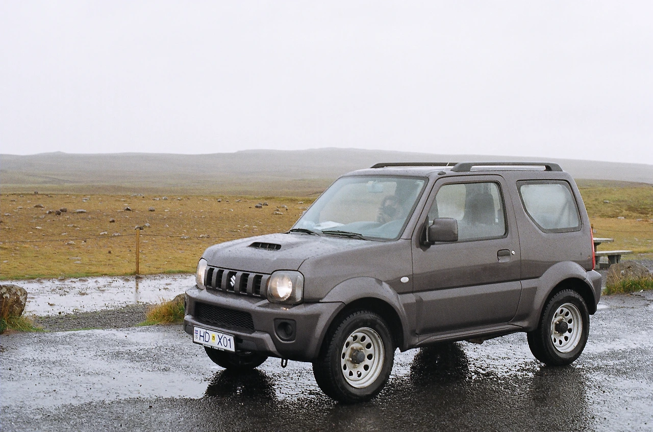 공항에서 입국 수속을 마치고 나와서 렌터카를 예약했었던 회사의 담당자를 만났다. 인사를 나누며, 옅은 비가 내리는 오늘 날씨가 이만하면 좋은 거라고 너스레를 떤다. 차 열쇠를 받고 짐을 옮겨 싣는다. 우리 차는 미니 4륜 지프차 '짐니'다. (Suzuki Jimny 4x4 Automatic Older model 2015) 이 작은 차가 아이슬란드 대자연 속에서 우리를 지켜줄까 의심스럽다.