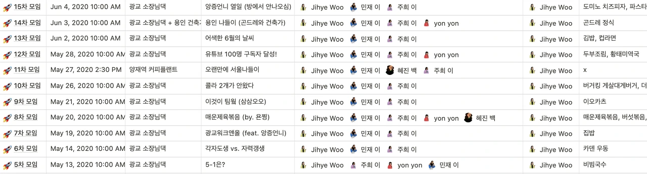 그렇다면 그 ‘가능성'은 대체 어디에서 찾았을까요. 바로 ‘회의록'에서 발견했습니다. 그동안의 프로젝트와 그것들을 준비하는 과정을 노션(www.notion.so)을 활용해 정리하고 있습니다. 퇴사한 이후부터 우리가 모여 이야기를 했다고 하면 그것을 모두 기록으로 남겼습니다. 아주 기본적인 것이지만, 그렇기 때문에 쉽지 않습니다. 마땅한 장소가 없어서 저희 집 거실에서 모였던 회의에서부터 사무실에서 회의를 진행한 오늘에 이르기까지 노션에 잔뜩 쌓은 회의의 기록들은 우리가 얼마나 가장 기본적인 것에 집중하고 있는지 보여줍니다.