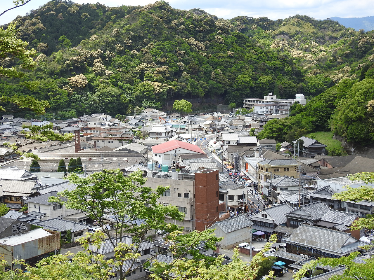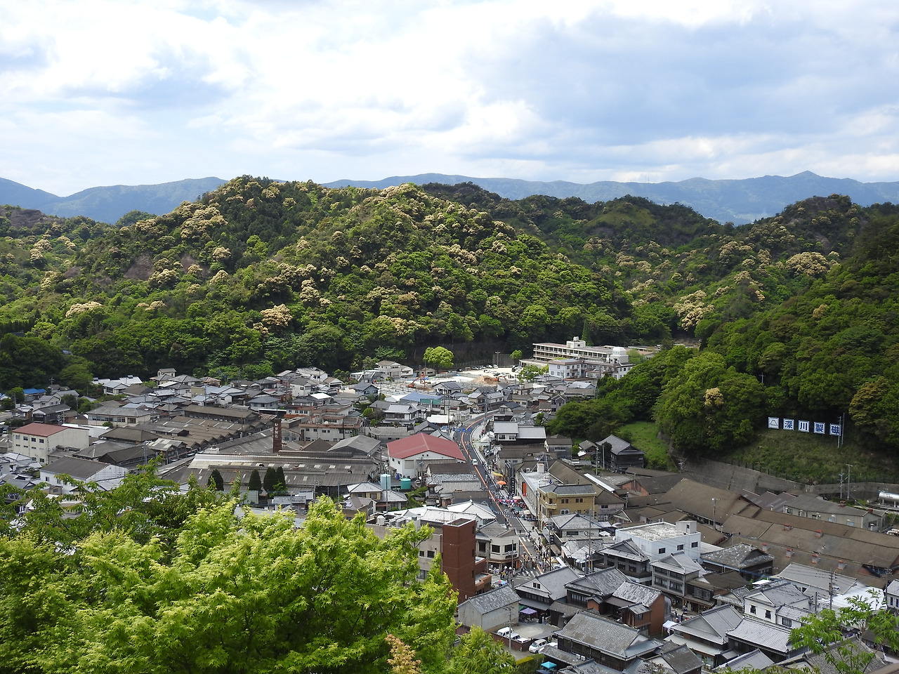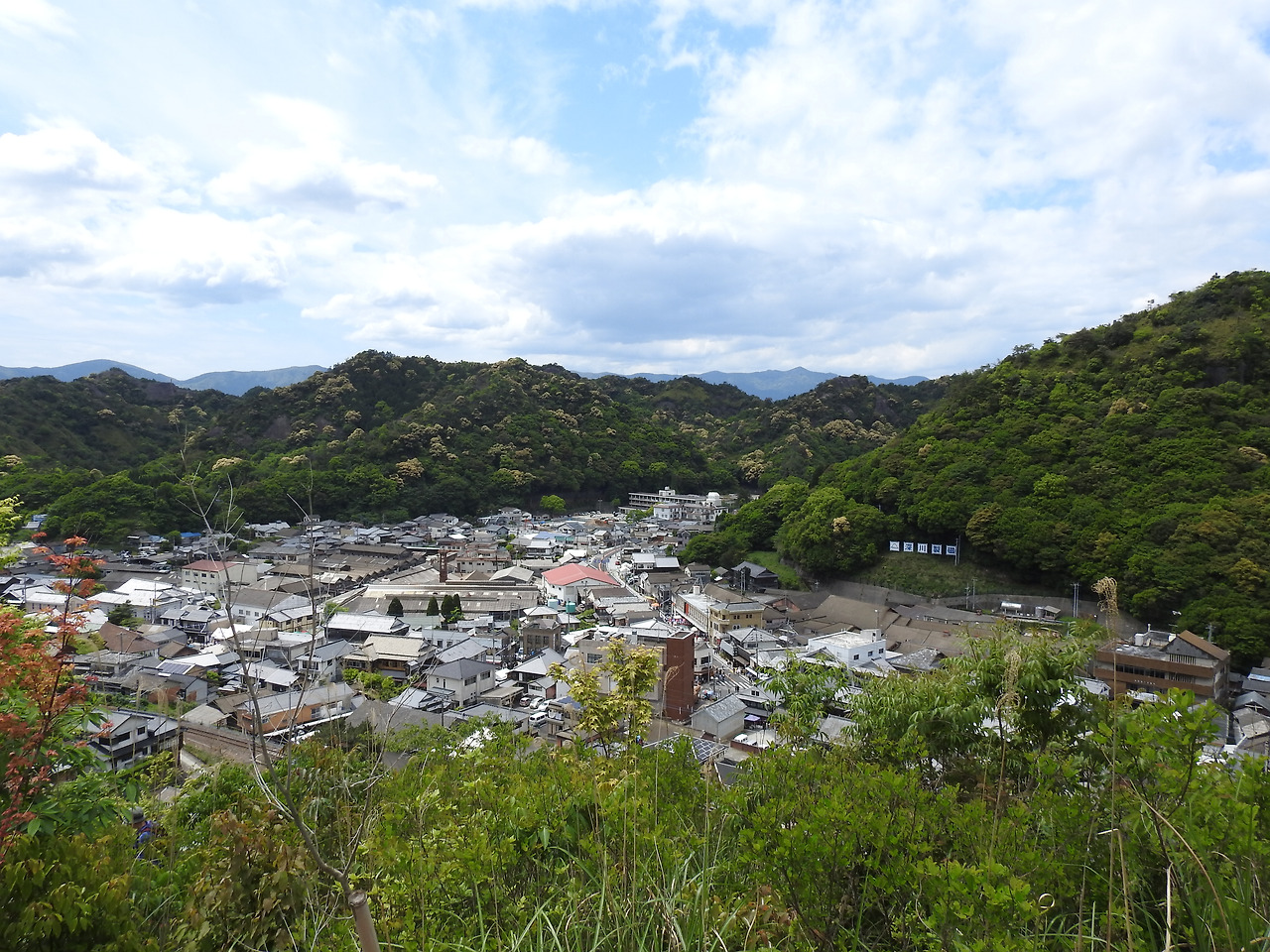 산에 둘러싸인 평화로운 마을이 한눈에 내려다 보인다.