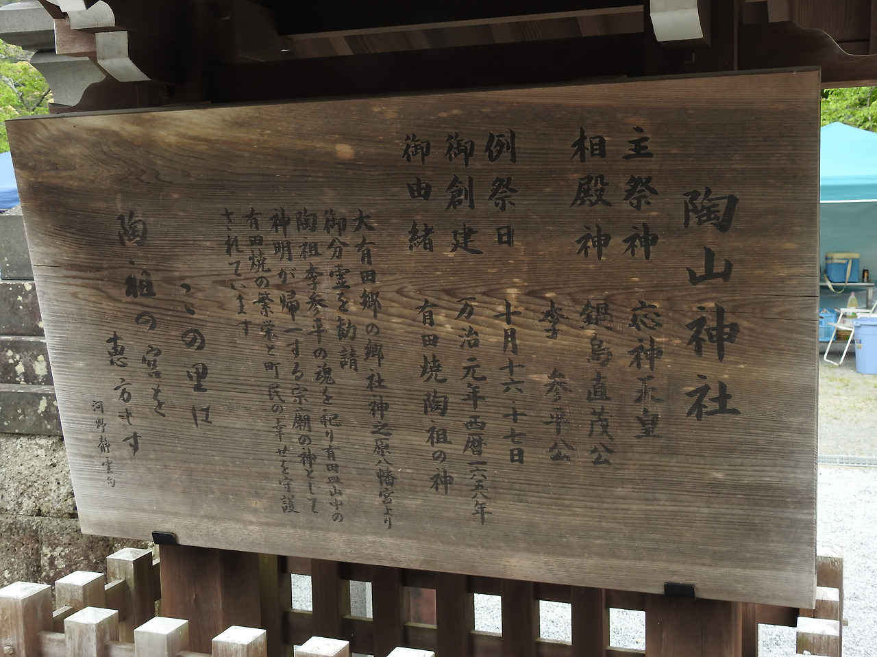 주제신(主祭神)과 상전신(相殿神)은 신사에서 모셔지는 주신과 부신을 뜻한다. 오우진(応神天皇) 천황과 자신을 끌고 온 나베시마 나오시게와 나란히, 공(公)으로 불리며으로 신의 반열에 올랐다. 이렇게까지 추앙 받을 것이라는 것을 생전의 이삼평은 알았을까.