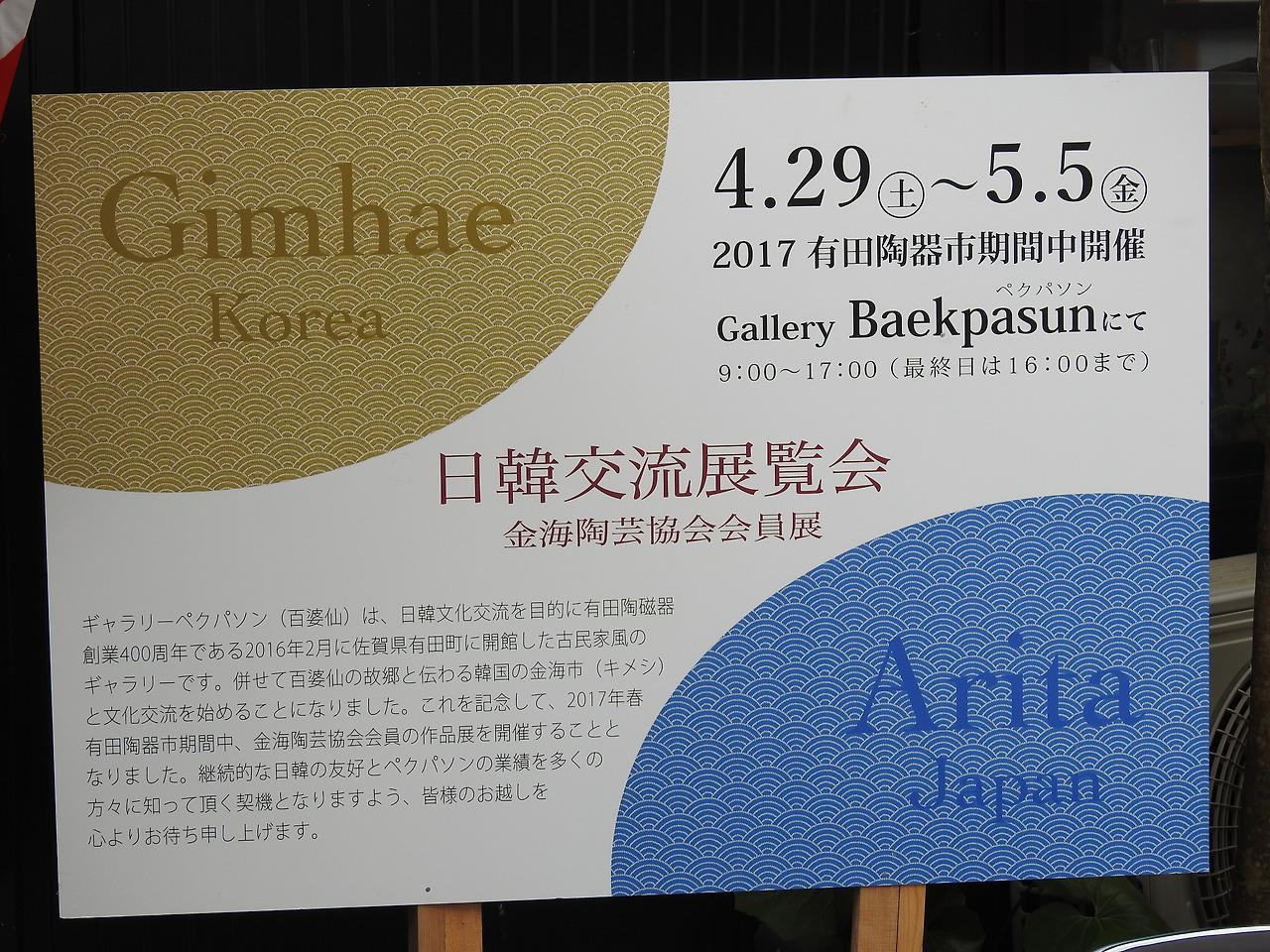 도중에 한글이 눈에 띄어 들어가봤다. 국내에 도자기로 유명한 곳은 김해인듯. 정작 국내 사정은 전혀 모르고, 일본의 유명 도자기 산지는 알고 있으니 부끄럽기 짝이 없다. 일한교류전람회. 아마 기념비 앞의 행사는 이 전시를 주최한 측이 했을 가능성도 있겠다. 과거 조선통신사, 수신사처럼 지속적인 교류의 장이 이어져서 앞으로는 영원한 평화만 있기를 바랄뿐이다.