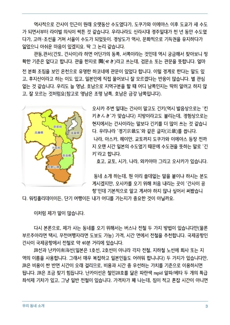 오사카 주변 일대는 간사이 말고도 긴키(역시 발음상으로는 ‘킨키きんき’가 맞습니다) 지방이라고도 불리는데, 경험상으로는 현지에서는 간사이라는 말보다 긴키를 더 많이 쓰는 것 같습니다. 우리나라 ‘경기京畿도’와 같은 글자(近畿)를 씁니다.