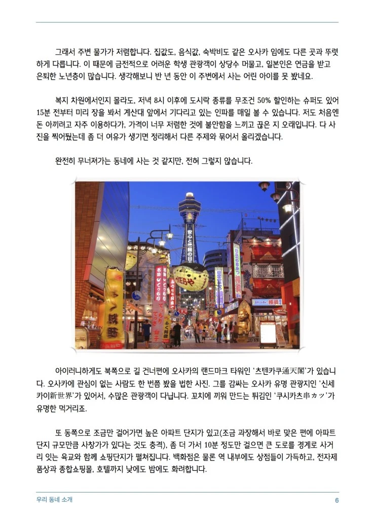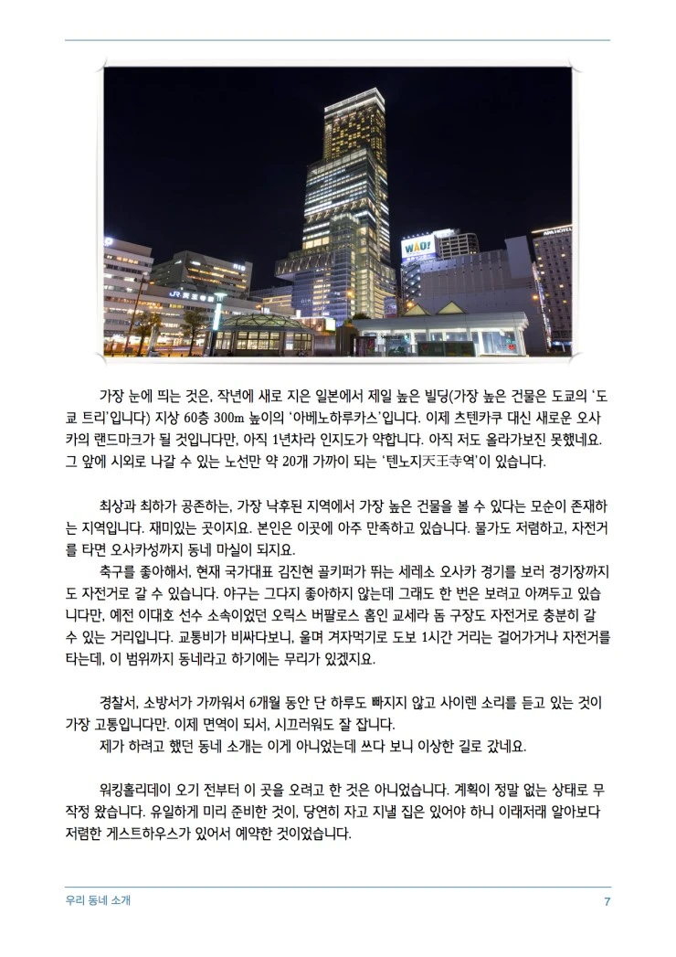 최상과 최하가 공존하는, 가장 낙후된 지역에서 가장 높은 건물을 볼 수 있다는 모순이 존재하는 지역입니다. 재미있는 곳이지요. 본인은 이곳에 아주 만족하고 있습니다. 물가도 저렴하고, 자전거를 타면 오사카성까지 동네 마실이 되지요.