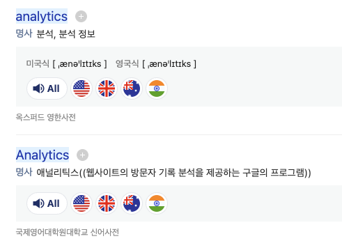 사전 이미지를 보시면 2번째 Analytics 설명의 국제영어대학원 신어 사전에 '웹사이트의 방문자 기록 분석을 제공하는 구글의 프로그램'이라고도 되어있네요. 이것도 완벽한 설명은 아닙니다만, 사전에까지 등록될 정도로 이제 고유명사가 되었습니다. 방문자 기록을 분석한다?