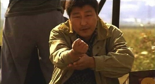 천태; 송강호는 모른다. 이건 감독의 영영이다. 현장을 훼손하는 아이들에게 투덜대던 두만이 배수로에 죽어있는 사체를 본다. 고개를 들다가 메뚜기 소년을 보고는 뭔가 이상한 듯 고개를 갸웃거린다. 소년이 두만을 노골적으로 놀리며 고개를 갸웃거리고, 그제사 두만의 표정이 심각하게 변한다. 그리고는 느닷없이 풍요로운 평야가 보이며 제목 ‘살인의 추억’이 쓰여진다.