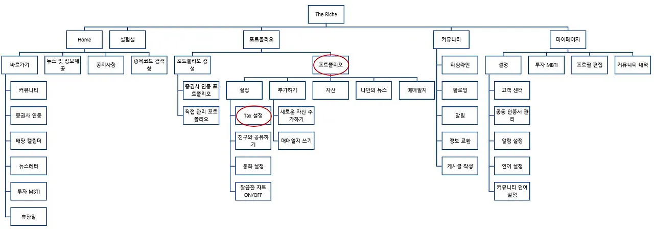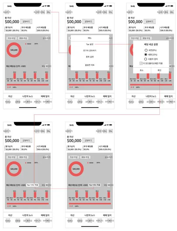 가이드를 제시하는 것을 제외한 설정에 들어가서 포트폴리오 별로 따로 Tax를 설정하고 포트폴리오에서 한눈에 세금 %를 확인하고 세금 전 / 후를 한눈에 확인할 수 있는 플로우를 1차 와이어 프레임으로 그렸다.