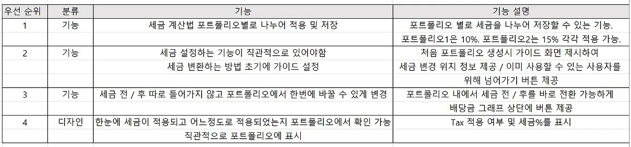 직관적으로 보이는 것도 중요하지만 일단 첫 번째로는 세금 적용이 먼저 되어야 한다고 판단했기에 포트폴리오 별로 나누어 적용되는 것을 최우선 순위로 설정하였다. 그 이후에는 tax를 설정하는 기능이 어디에 있는지 가이드를 제공해야 신규 고객들도 어려움 없이 이용할 수 있기에 2순위로 설정하였고 디자인 관련된 사항은 이미 정확하게 세금이 몇 %로 적용되고 있는지 까지는 보여주지 않지만 세금이 적용된 배당금인지 적용되지 않은 배당금인지는 지금도 확인할 수 있기에 마지막 순위로 설정하였다.
