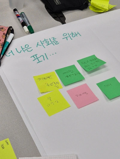 다소 포괄적이며 추상적이라는 생각에 해당 질문을 받아 들고는 먼저 질문의 재정의부터 시작하였다. 각자가 생각하는 더 나은 사회란 무엇일까. 나는 각자의 나다움을 이야기했고, 그렇다면 각자의 나다움을 인정받는 사회를 무조건적으로 나은 사회라고 할 수 있을지 질문이 뻗어 나갔다. 다른 조원분들에게 포기의 경험이 있는지, 있었다면 어떠한 것이었는지 물었다. 미움받을 용기, 사랑받을 기회, 돈(기부), 시간, 귀찮음 등 다양한 답변들이 나왔다. 우리는 기후위기시대 속에 에어컨을 틀지 않고 살 수 있을까. 출퇴근하기 바쁜 시간에 버스에 휠체어를 타고 오르는 분을 기다릴 수 있는 여유가 있을까. 많은 고민과 일상의 경험이 떠올랐다.
