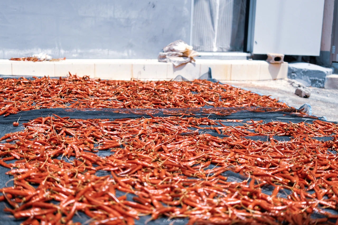 영남루만큼이나 오랜 시간 동안 이곳에서 터줏대감 역할을 해 온 것이 바로 밀양시장이다. 방앗간 옆에 널어놓은 홍고추가 바삭하게 햇빛 아래서 잘 마르고 있다.