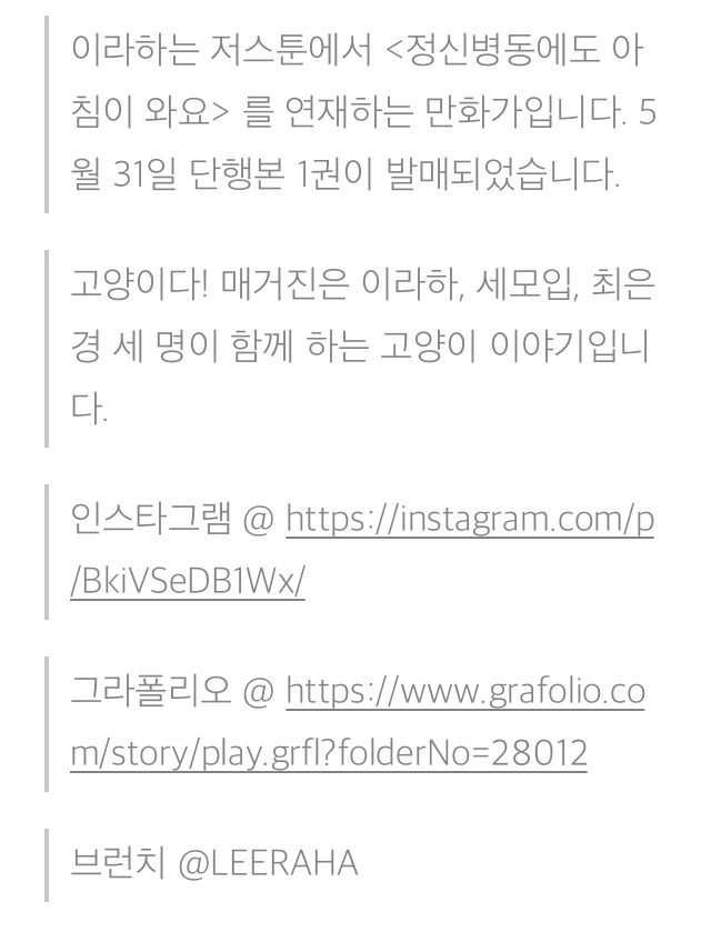 대표작 <정신병동에도 아침이 와요> 카카오페이지, 네이버 시리즈, 코미코 연재 중, 넷플릭스 드라마 제작중.