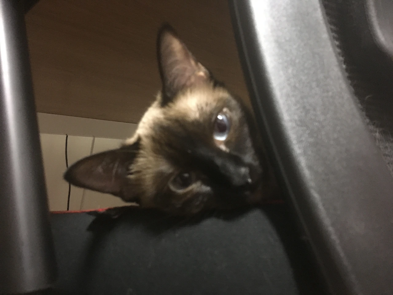 의자 뒤에서 고개만 쏘옥 내밀고 바라보는 나미고양.