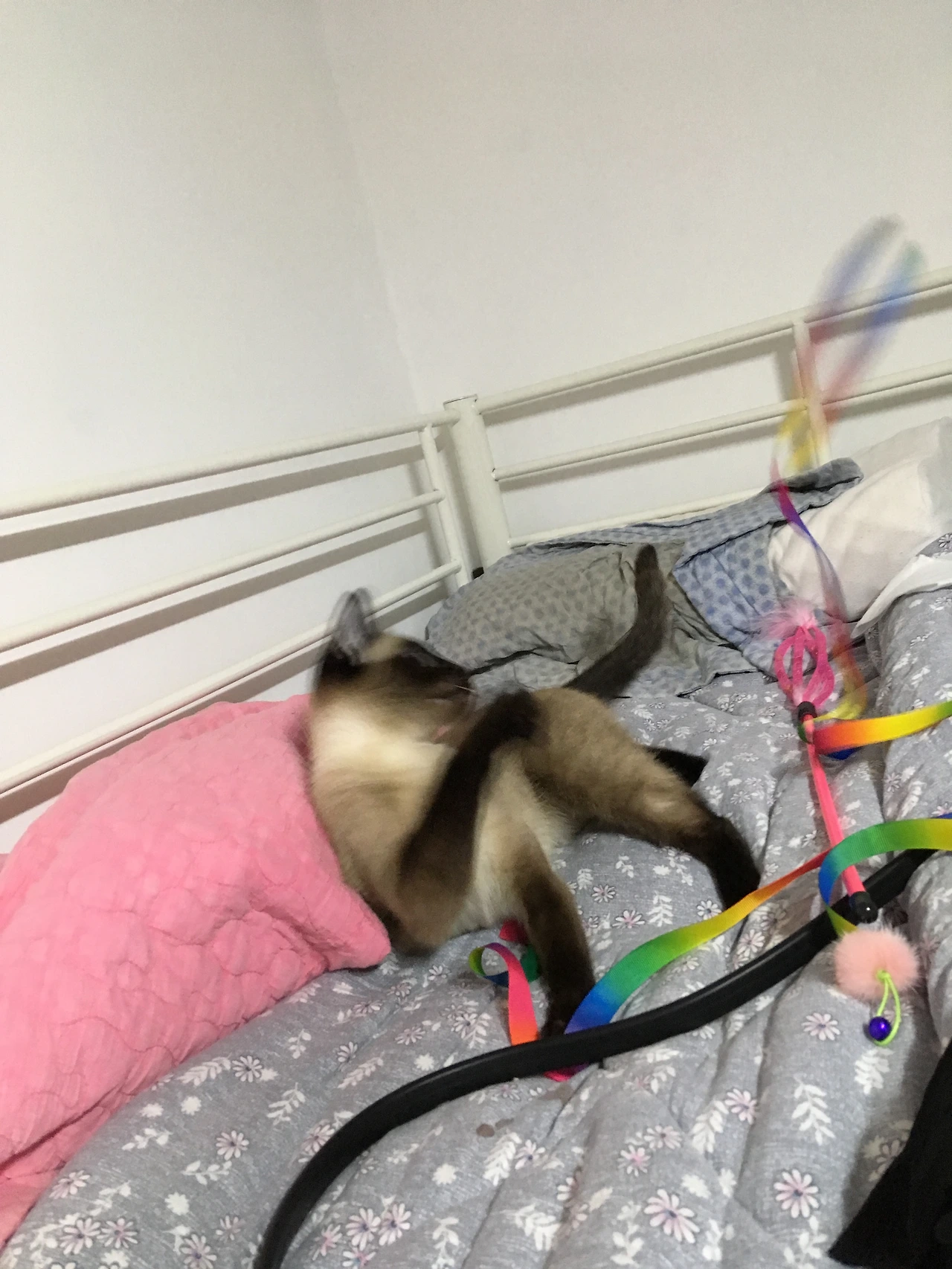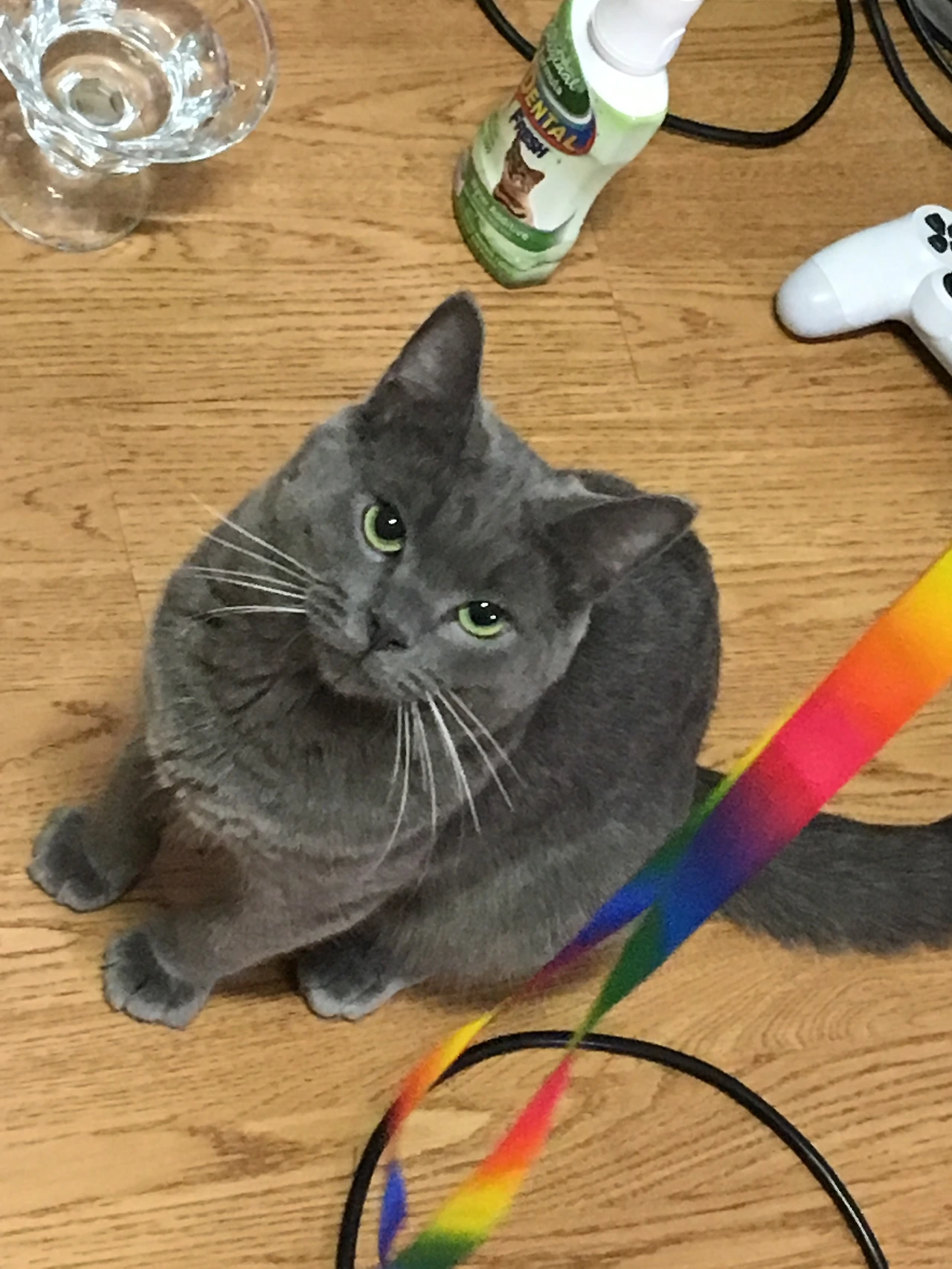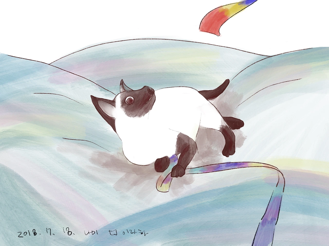 새로 온 무지갯빛 리본을 흔들며 방울 딸랑 소리를 내자 고양이 두 마리가,