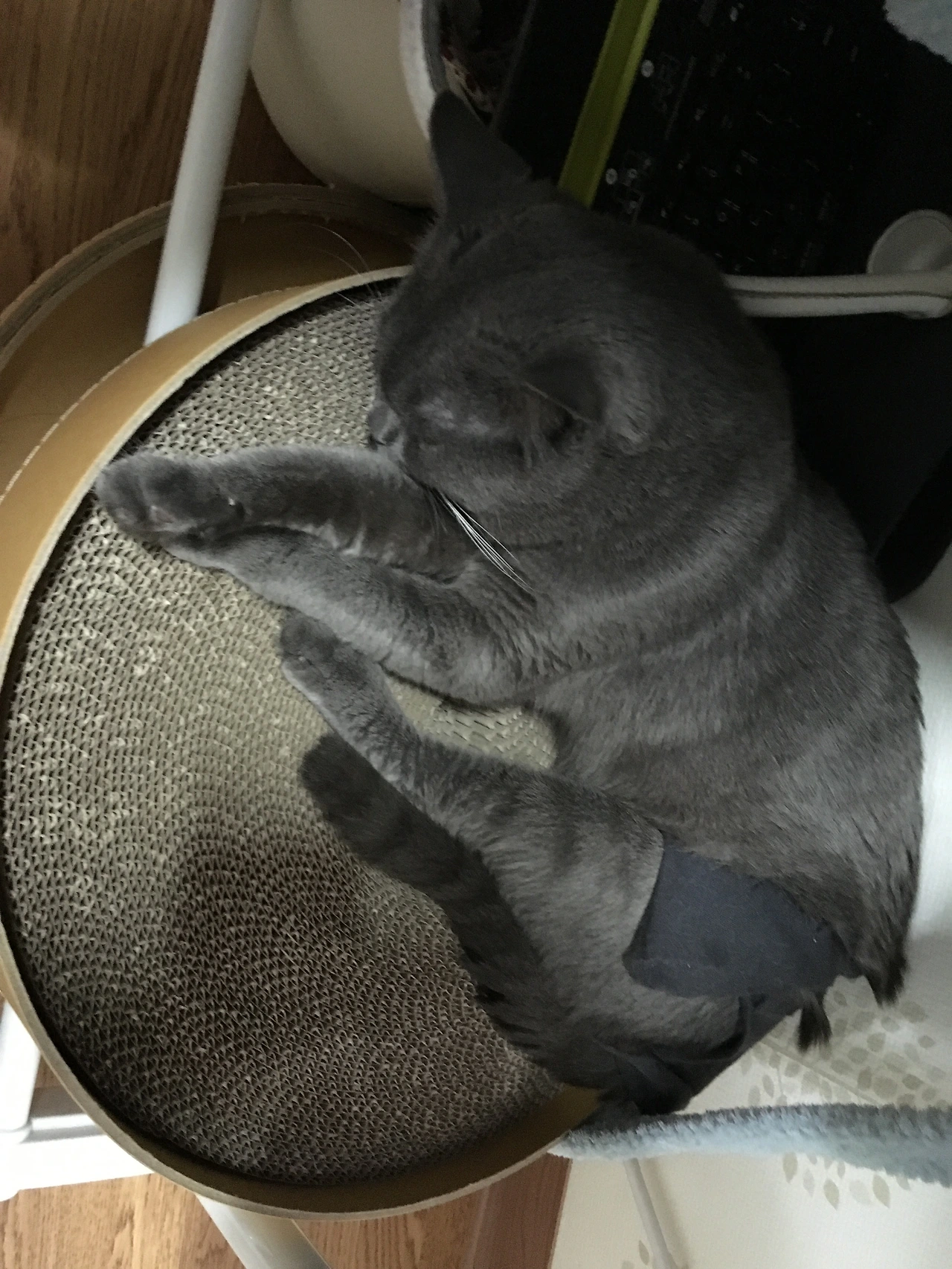 나찌앤네뽀 스크래쳐 위에서 몸을 웅크리고, 계속해서.