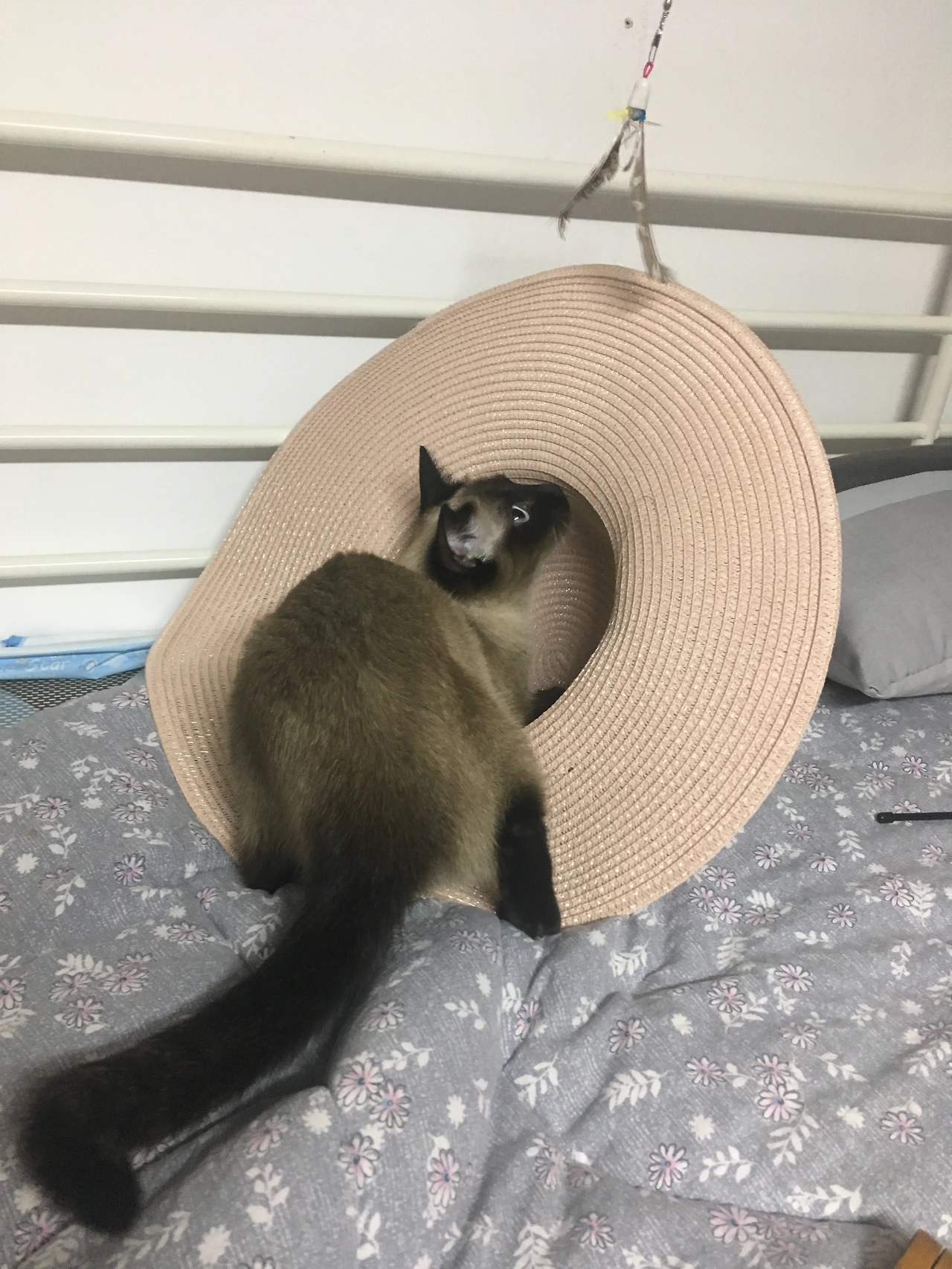 한참 동안 즐기다가, 모자를 등에 얹고 앞발을 뻗어 보기도 하고.