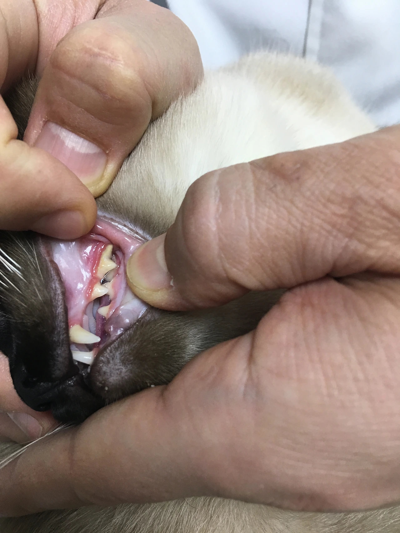 잇몸과 이 사이에 있는 붉은 줄은 둘째 고양이의 것보다 훨씬 더 심했다.