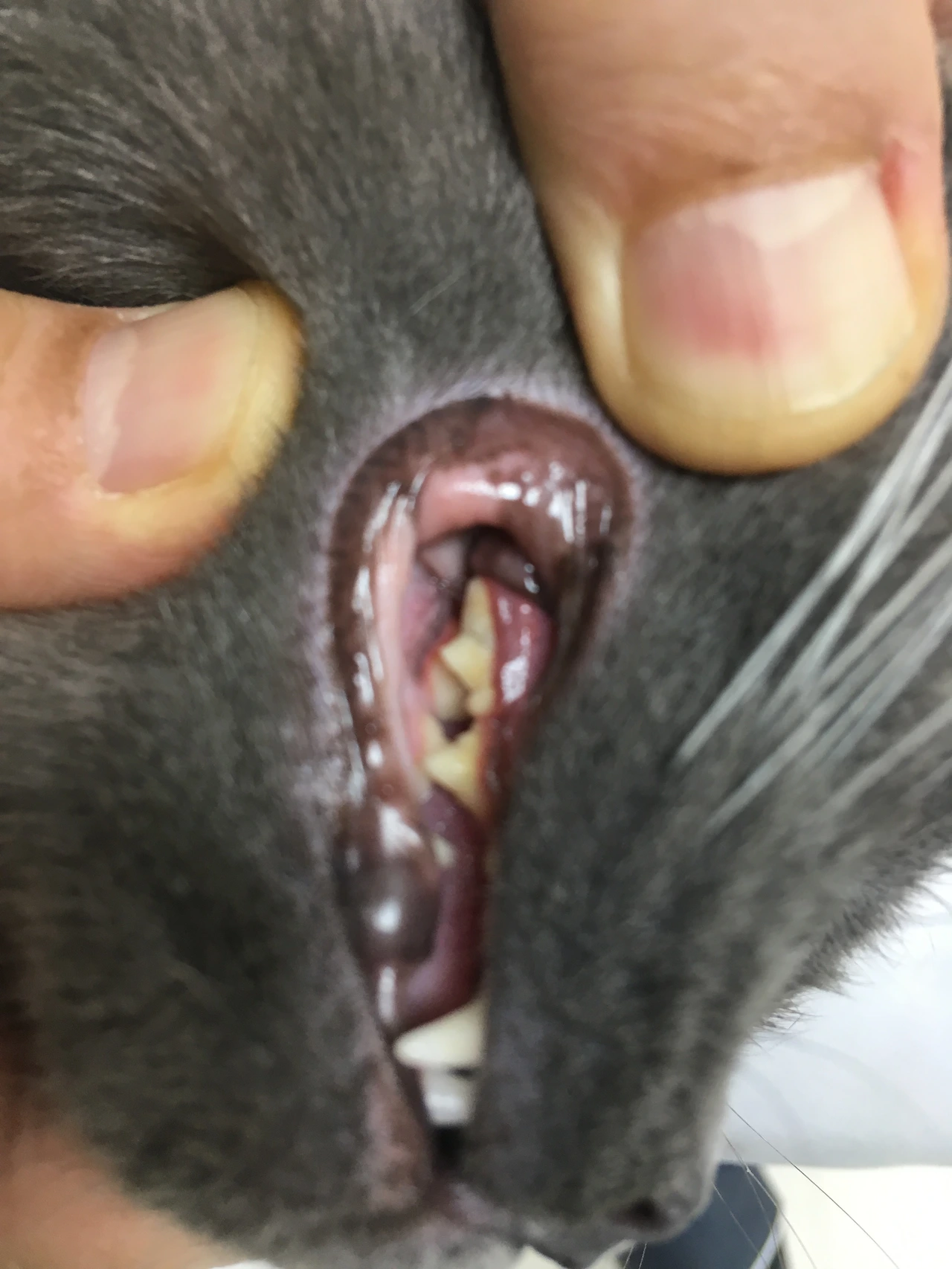 러시안 블루 믹스인 둘째 '제르'는 잇몸에 약한 염증이 있다는 진단을 받았다. 검핑크색 잇몸은 아무 문제가 없고, 잇몸과 이 사이에 있는 붉은 줄이 문제라고 했다.