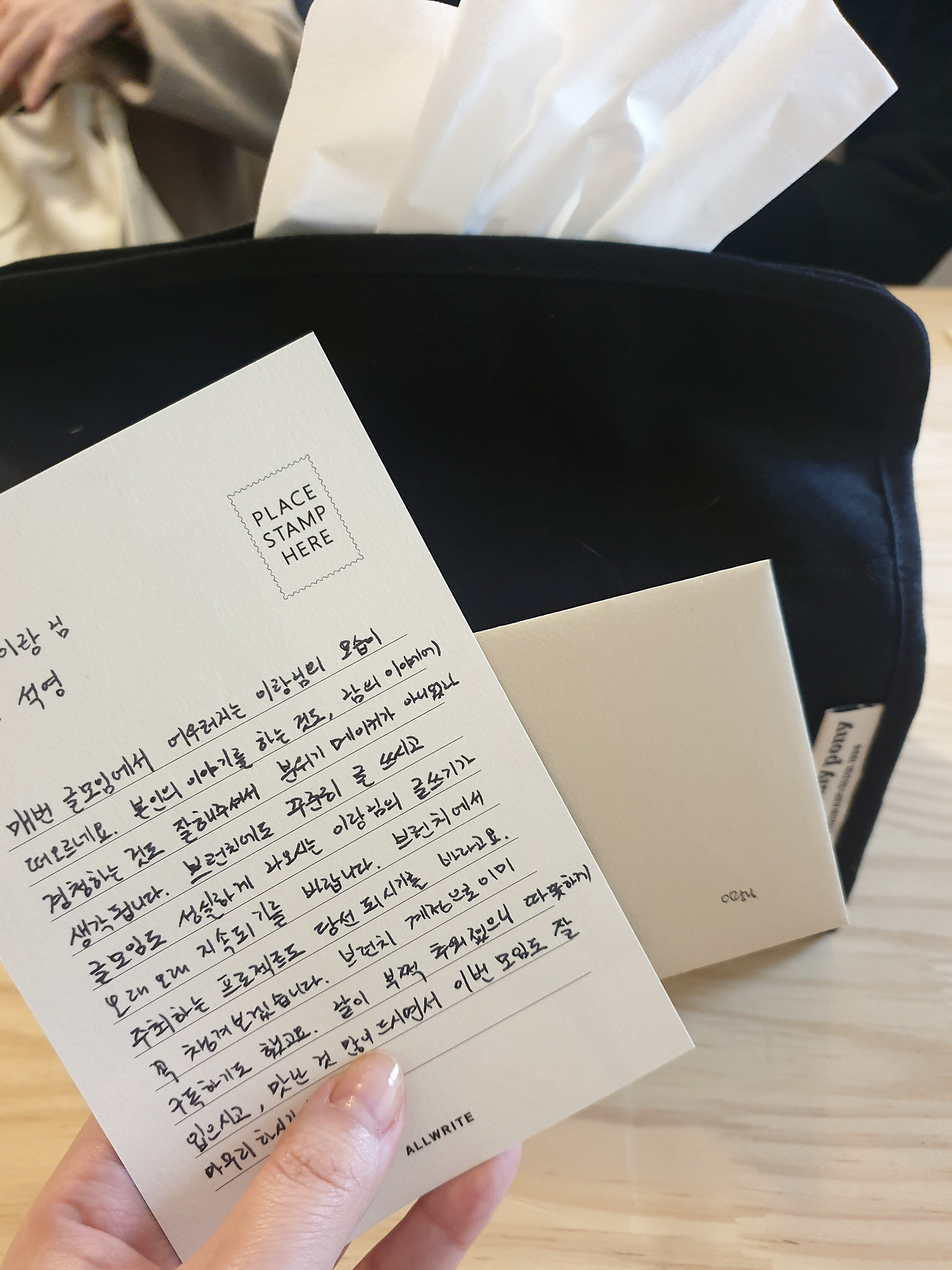 10월 29일. 마지막 글쓰기 모임의 주제는 '사랑'. 이제 길 좀 안다고 여유를 부리다 지각을 했다. 허겁지겁 뛰어 들어갔는데 '정아'님이 초콜릿을 주셨다. 마지막 날이라 준비하셨다는 말에 정신없이 오느라 잊었던 사실을 깨달았다. 내 차례가 되었다. 울지 않겠다는 다짐으로 내 기준 나름 담담히 읽어 내려갔다. 그러다 마음으로는 알지만 실제로 그렇게 행동하지 않는 나를 발견하는 구절에서 터져 결국 눈물로 마무리를 지었다. 사랑이라는 말을 쓰지 않고도 사랑을 표현한 글이라며 초반부 내용이 좋았다! 는 작가님의 피드백 덕분에 그래도 웃을 수 있었다. 홀가분한 마음으로 귀를 기울여 한 명 한 명의 이야기를 들었다. 그 글과 사람이 똑 닮아서 아쉬운 마음이 더했다. 두 장의 티슈와 함께 '고유 글방' 마지막 수업을 마쳤다.