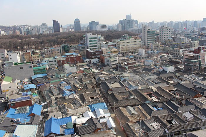 그래서일까? 인근 고층 빌딩에서 바라본 익선동의 풍경은 고풍스러운 분위기의 한옥마을과는 전혀 다른 모습이었다. 좁은 지역에 따닥따닥 들어앉자 있는 한옥 100여 채는 서로를 감싸듯 모여 있었다. 그중에서는 금방이라도 허물어질 것 같은 낙후된 건물도 보였다. 또 저 멀리에는 도심 속의 고층건물도 눈에 띈다. 이러한 모습은 서울 도심에서 흔히 접할 수 없는 풍경이다.