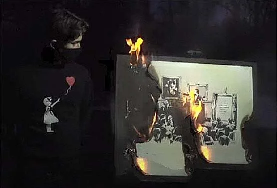 ‘불탄 뱅크시’는 2021년 3월 11일 크리스티의 비플 경매 직전 자신들이 구매한 1억 700만 원의 뱅크시의 판화 작품인 ‘멍청이’를 스캔해 NFT로 만든 뒤 불에 태우는 이벤트를 트위터로 공개했다. 유튜브에는 2021년 3월 4일 영상이 올라온 터였다.(사진=유튜브)