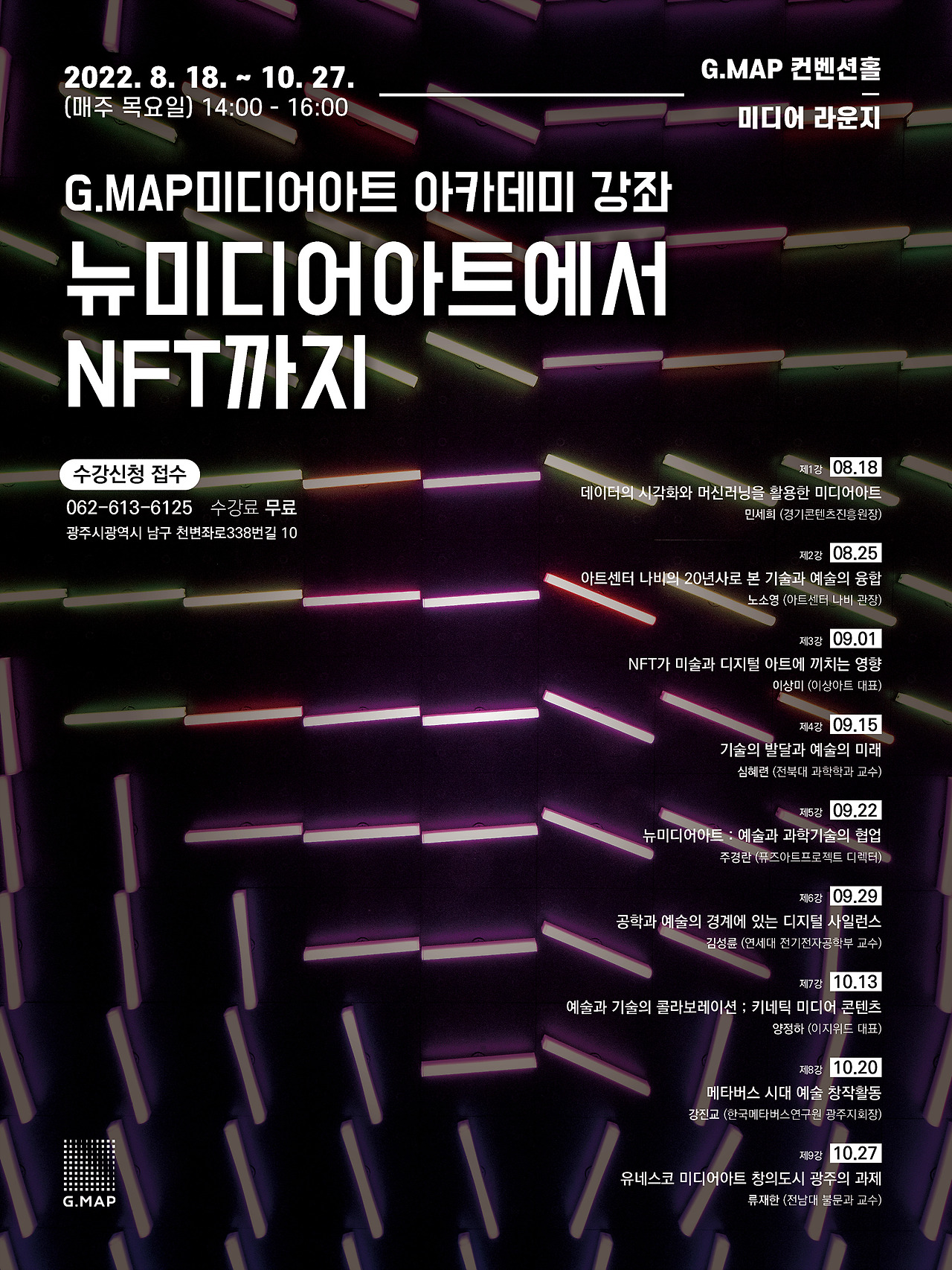 G.MAP이 마련한 <뉴미디어아트에서 NFT까지> 강좌는 미디어아트에 관심 많은 일반 시민과 전문가들을 대상으로 하는 무료 강연이다. 오는 8월 18일부터 10월 27일까지 매주 목요일마다 총 9회에 걸쳐 진행된다.