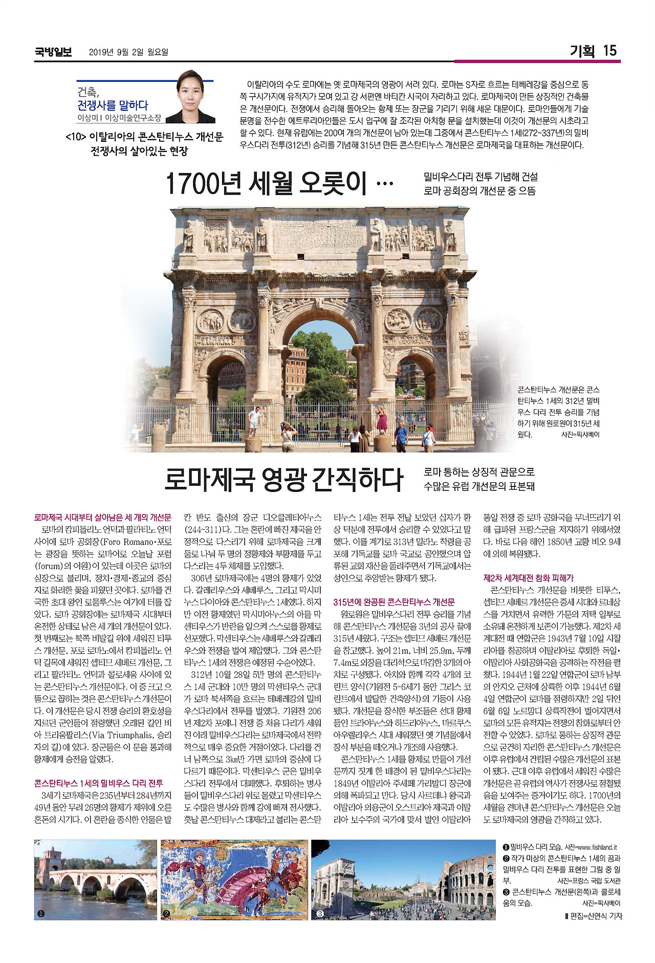 이탈리아의 수도 로마에는 옛 로마제국의 영광이 서려 있다. 로마는 S자로 흐르는 테베레강을 중심으로 동쪽 구시가지에 유적지가 모여 있고 강 서편엔 바티칸 시국이 자리하고 있다. 로마제국이 만든 상징적인 건축물은 개선문이다. 전쟁에서 승리해 돌아오는 황제 또는 장군을 기리기 위해 세운 대문이다. 로마인들에게 기술 문명을 전수한 에트루리아인들은 도시 입구에 잘 조각된 아치형 문을 설치했는데 이것이 개선문의 시초라고 할 수 있다. 현재 유럽에는 200여 개의 개선문이 남아 있는데 그중에서 콘스탄티누스 1세(272~337년)의 밀비우스다리 전투(312년) 승리를 기념해 315년 만든 콘스탄티누스 개선문은 로마제국을 대표하는 개선문이다.