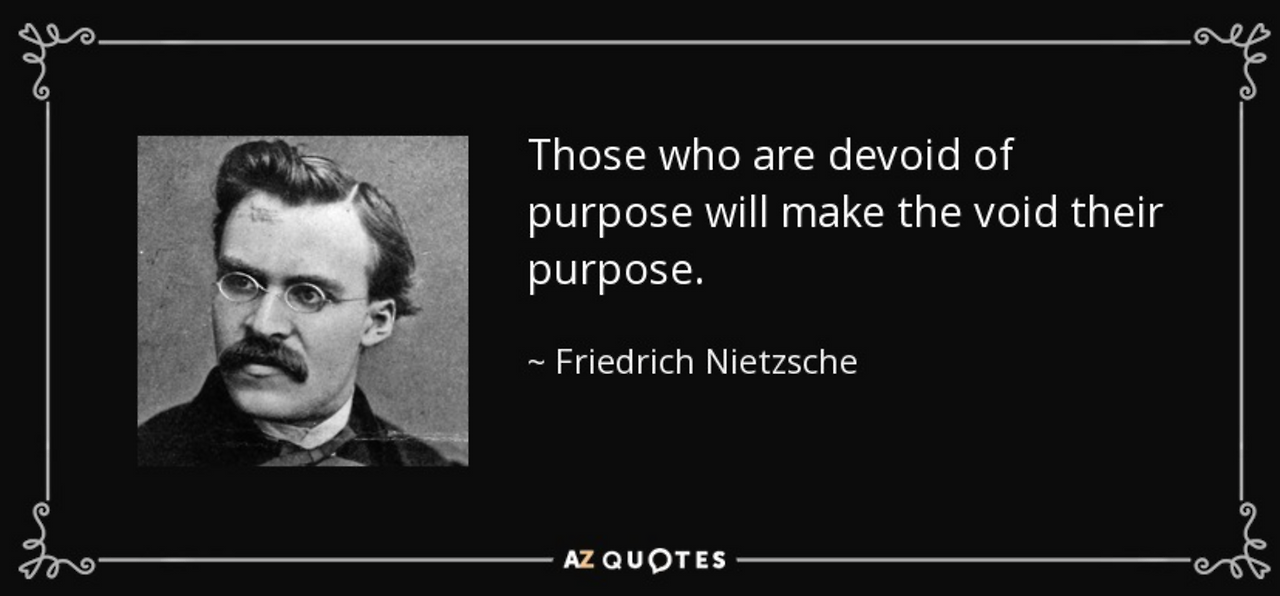 니체는 말했다. "목적이 없는 사람들은 공허함을 그들의 목적으로 만든다(Basic Writings of Nietzche)." 반대로 그는, 살아야 할 이유가 있는 사람은 모든 것을 견딜 수 있다고 말했다 (He who has a why to live for can bear almost any how.) 윤정구 교수님이 인용한 번역이 더 와닿는다.