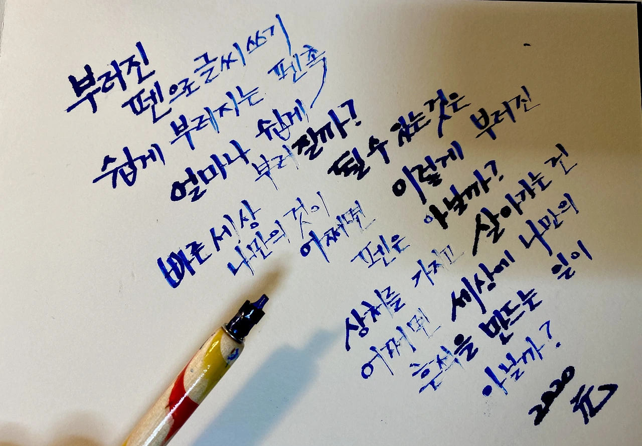 얼마 전 제가 좋아하는 딥펜을 구입했습니다. 비싼 물건은 아니지만 저만의 글씨체를 연습하고 있기에 기대하며 구입한 것입니다. 하지만 한번 사용했을 뿐인데 보관이 잘못되었는지 펜촉의 앞부분이 미세하게 떨어져 나갔더군요. 오랜만에 마음에 드는 펜촉이라 생각했는데 부러진 펜촉을 보니 마음이 쓰라렸습니다. 하지만 그 부러진 펜촉을 가지고 그냥 글씨를 써 보았습니다. 글씨를 쓰면서 또 하나를 깨닫게 되었습니다.