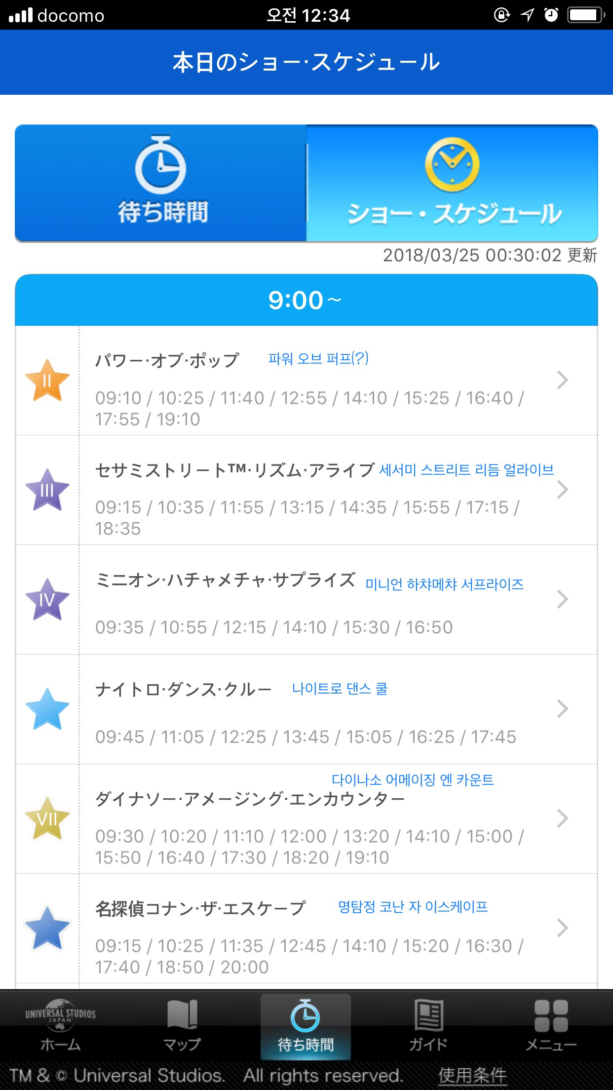 어트랙션 별 대기시간이 좌르륵 나온다.